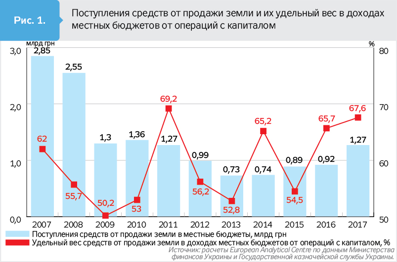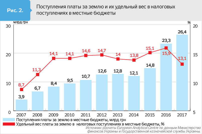 Обвал рынка земель несельскохозяйственного назначения произошел в 2009 г. не только из-за глобального финансового кризиса, срикошетившего по Украине, но и по той причине, что продавались в основном уже земли, не так интересующие бизнес и граждан, как в предыдущие периоды, потому и поступления от продажи на порядок снизились. В 2017 г. поступления от продажи земли в местные бюджеты по сравнению с 2007 г. уменьшились на 1,58 млрд грн.