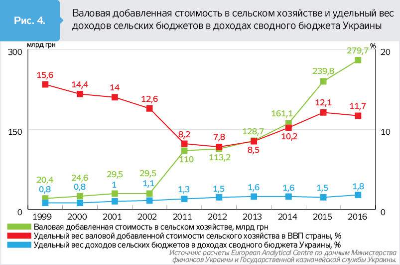 Удельный вес валовой добавленной стоимости сельского хозяйства в ВВП страны в 1999 г. составил 15,6%, в 2002-м - 12,6, в 2016-м - 11,7%. В 2016-м по сравнению с 1999-м и 2011 г. валовая добавленная стоимость в сельском хозяйстве увеличилась в разы. Зато удельный вес доходов сельских бюджетов в доходах сводного бюджета Украины колебался в пределах 0,8–1,8%.
