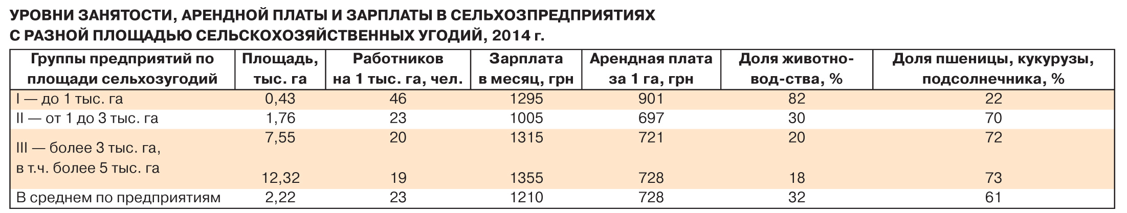 Относительно заработной платы. Крупные сельхозпредприятия с площадью землепользования свыше 3 тыс. га платили своим работникам заработную плату в 2014 г. в размере 1315 грн, что почти сопоставимо с зарплатой в значительно меньших предприятиях. Этот уровень только на 8% превышал установленный государством базовый социальный стандарт - минимальную зарплату (1218 грн), что было равно прожиточному минимуму.