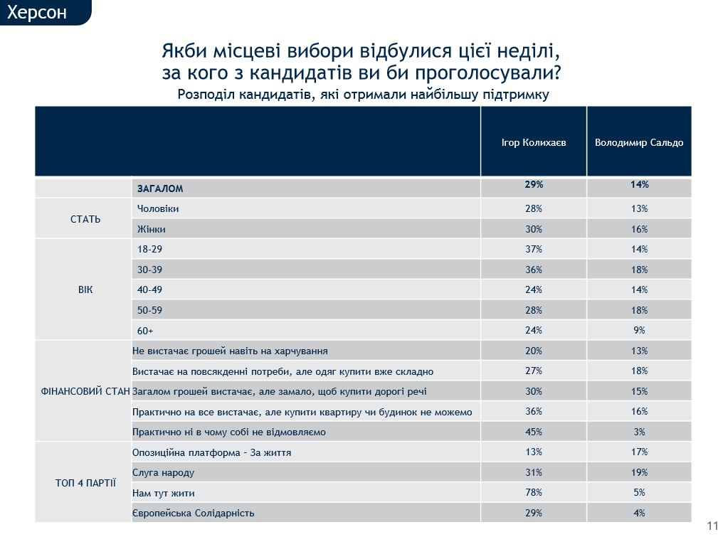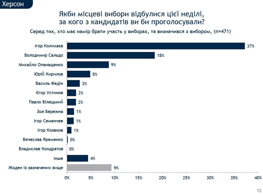 И, похоже, будут делить и впредь. Владимир Миколаенко ожидаемо не баллотируется. Уже очевидно, что основная борьба за место в финале будет проходить между Игорем Колыхаевым (у него 37% поддержки, и он — лидер гонки, у его местного проекта «Нам тут жить» 19%, и это третья позиция в партийном рейтинге) и Владимиром Сальдо (экс-мэр — второй, у него 18% и шанс выйти во второй тур, но «Блок Сальдо» — лузер). Херсону точно не избежать не только второго тура выборов городского головы, но и большого торга в городской раде. Однако сначала кандидаты.