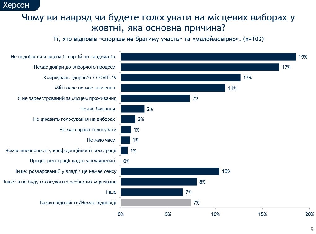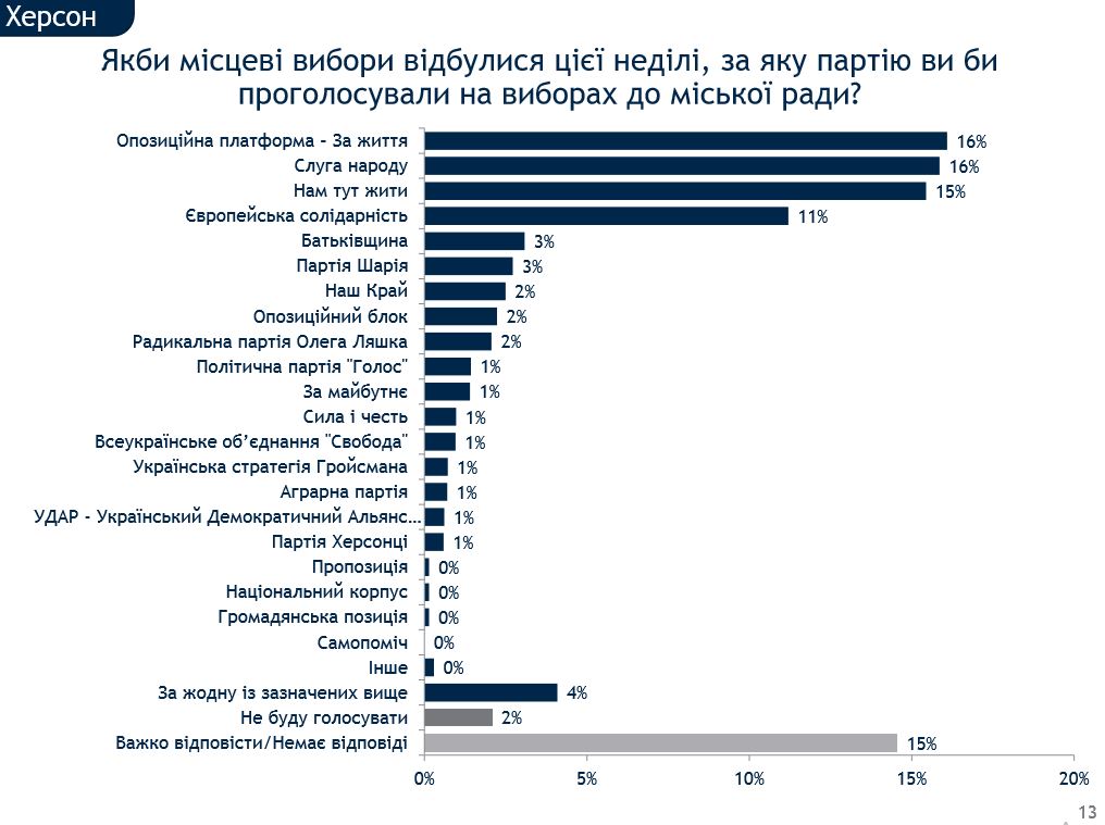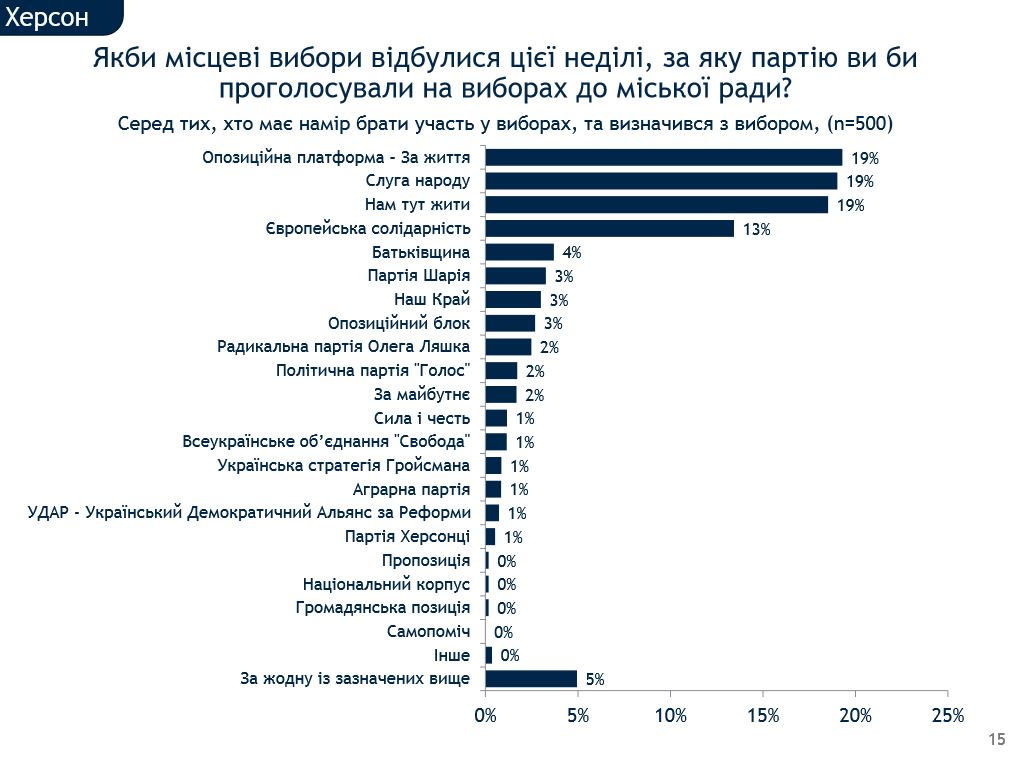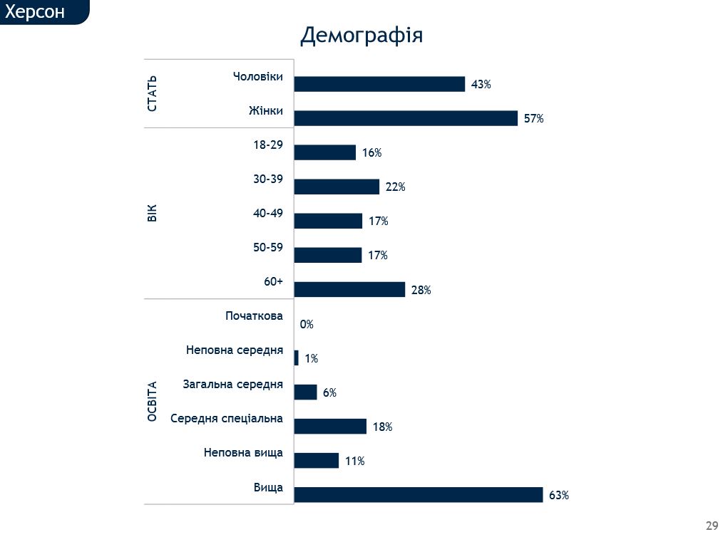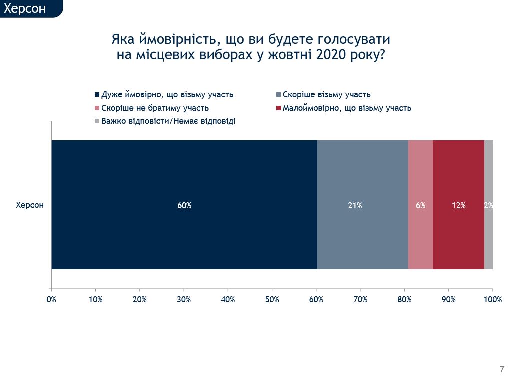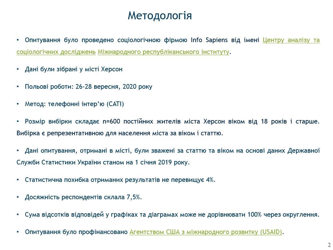 Опрос проведен социологической компанией Info Sapiens по заказу Международного республиканского института (IRI). Данные собирались в городе Херсон 26–28 сентября 2020 года методом телефонного интервью (CATI). Размер выборки составляет n = 600 постоянных жителей города в возрасте от 18 лет. Выборка является репрезентативной. Статистическая погрешность не превышает 4%.
