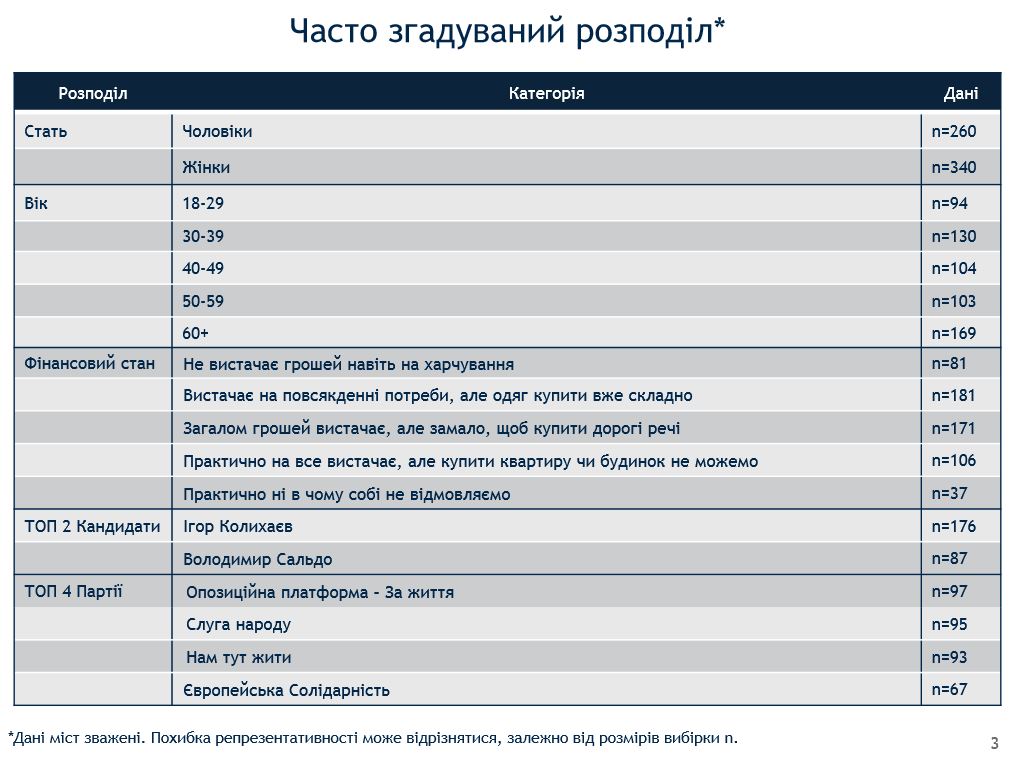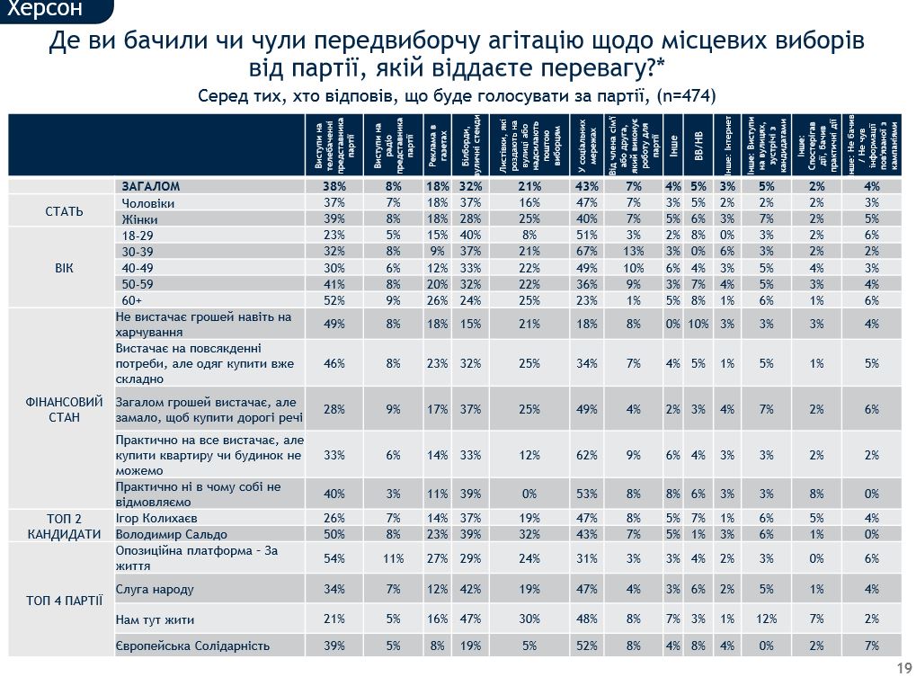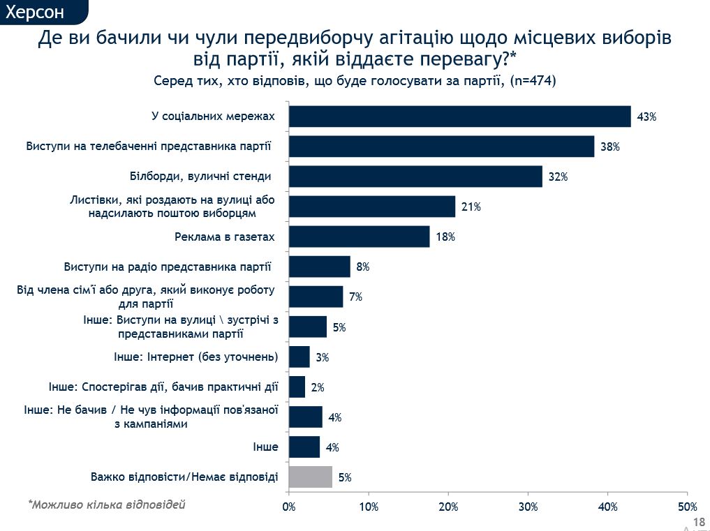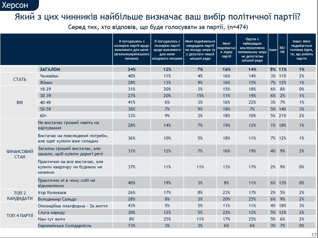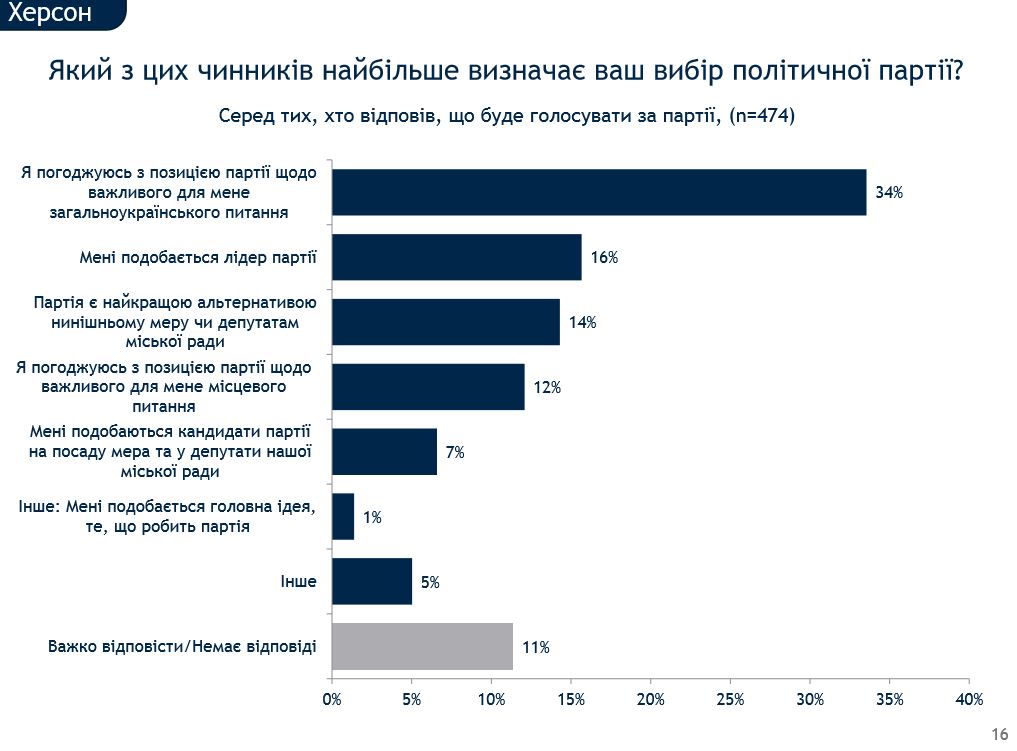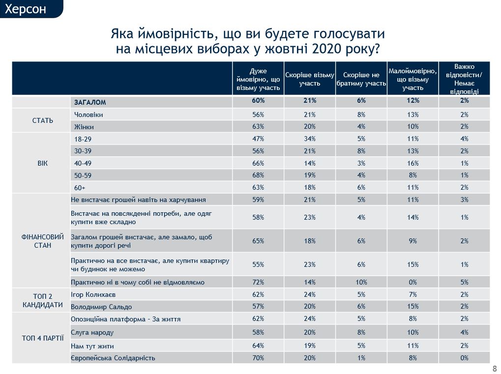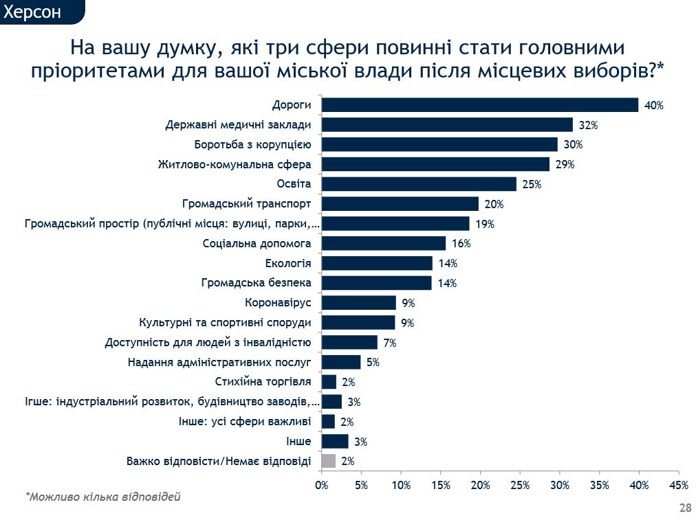 Опрос проведен социологической компанией Info Sapiens по заказу Международного республиканского института (IRI). Данные собирались в городе Херсон 26–28 сентября 2020 года методом телефонного интервью (CATI). Размер выборки составляет n = 600 постоянных жителей города в возрасте от 18 лет. Выборка является репрезентативной. Статистическая погрешность не превышает 4%.