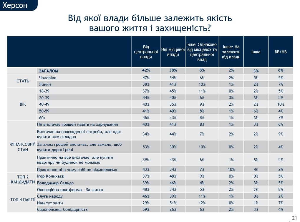 Херсон, потеряв ориентир внутри, настойчиво смотрит в сторону Центра: 42% горожан считают, что их жизнь больше зависит от столичной власти. Но 38% при этом все-таки полагаются на местную.