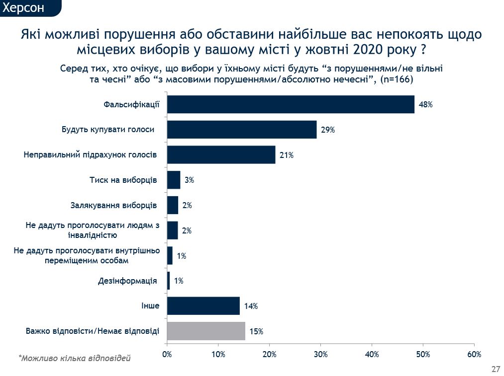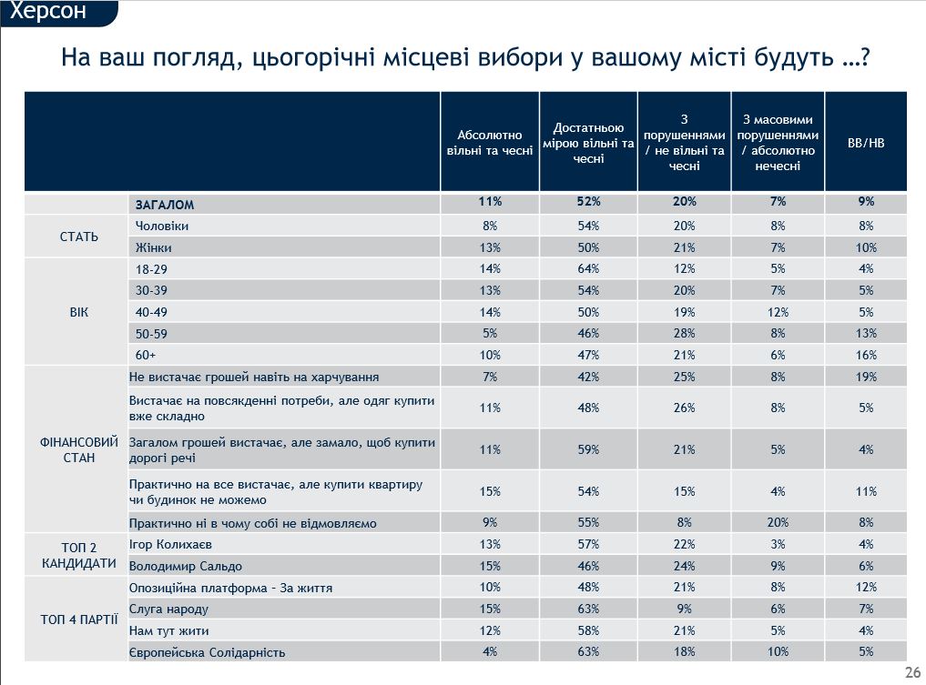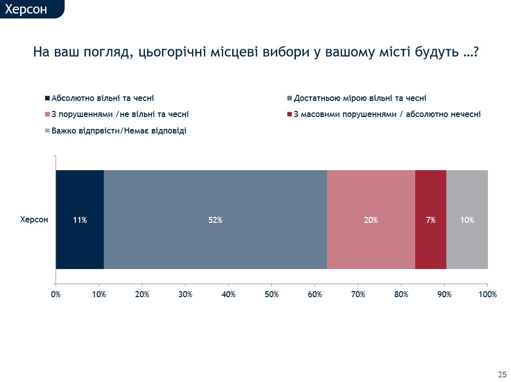 63% горожан считают, что выборы в Херсоне будут честными, а если и нет, то 48% предполагают, что возможны фальсификации, и в два раза меньше людей (28%) заявили о реальности скупки голосов.
