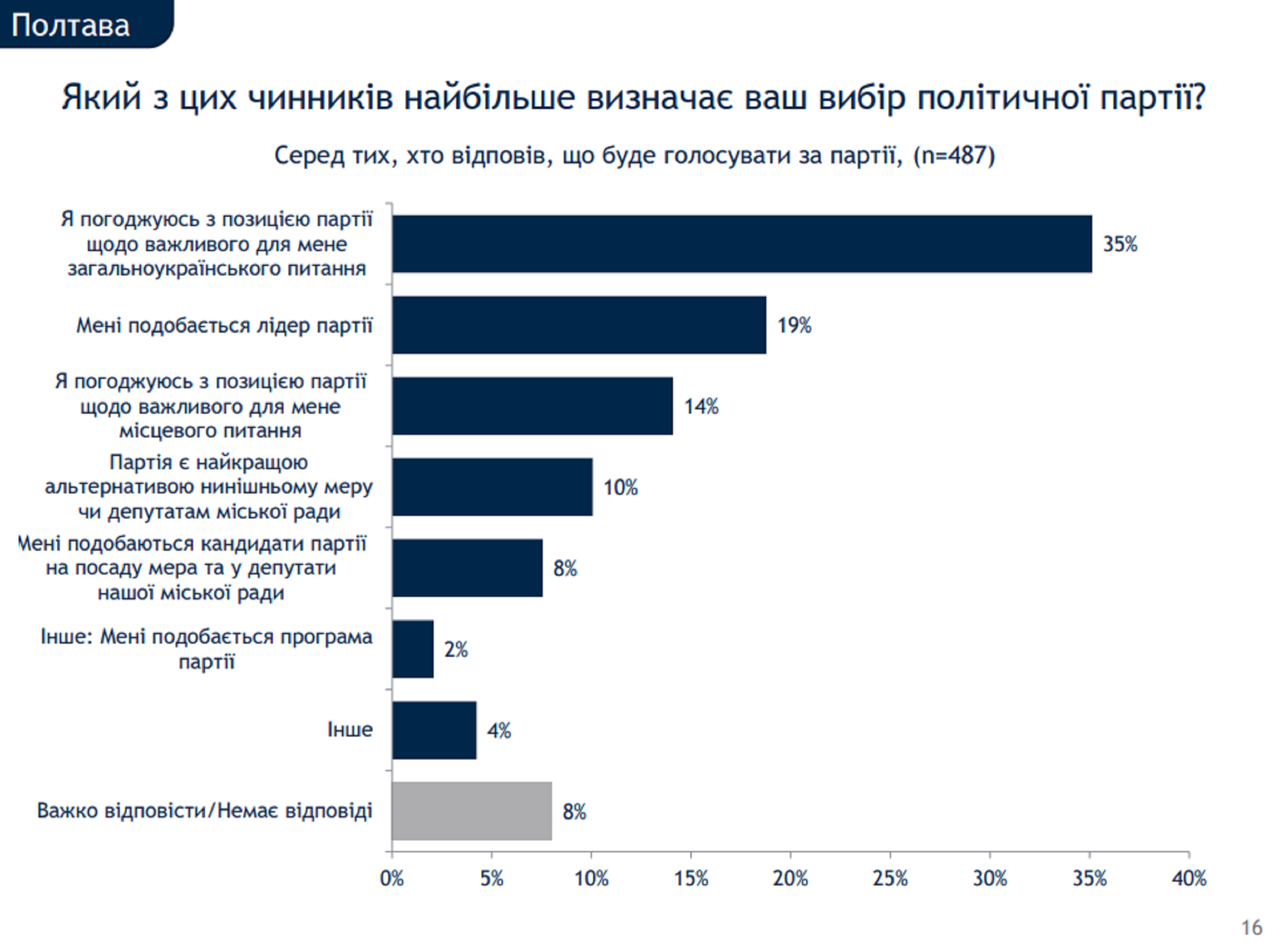 Горячие войны местных элит последней пятилетки, очевидно, сильно достали полтавчан. 50% жителей не поддерживают политику городской власти и только 37% — ее разделяют. При этом не слишком расположены горожане и к центральной власти: большинство (53%) не одобряют ее курс, поддерживают — 33%. То есть и город, и страна, по мнению полтавчан, движутся куда-то не туда.