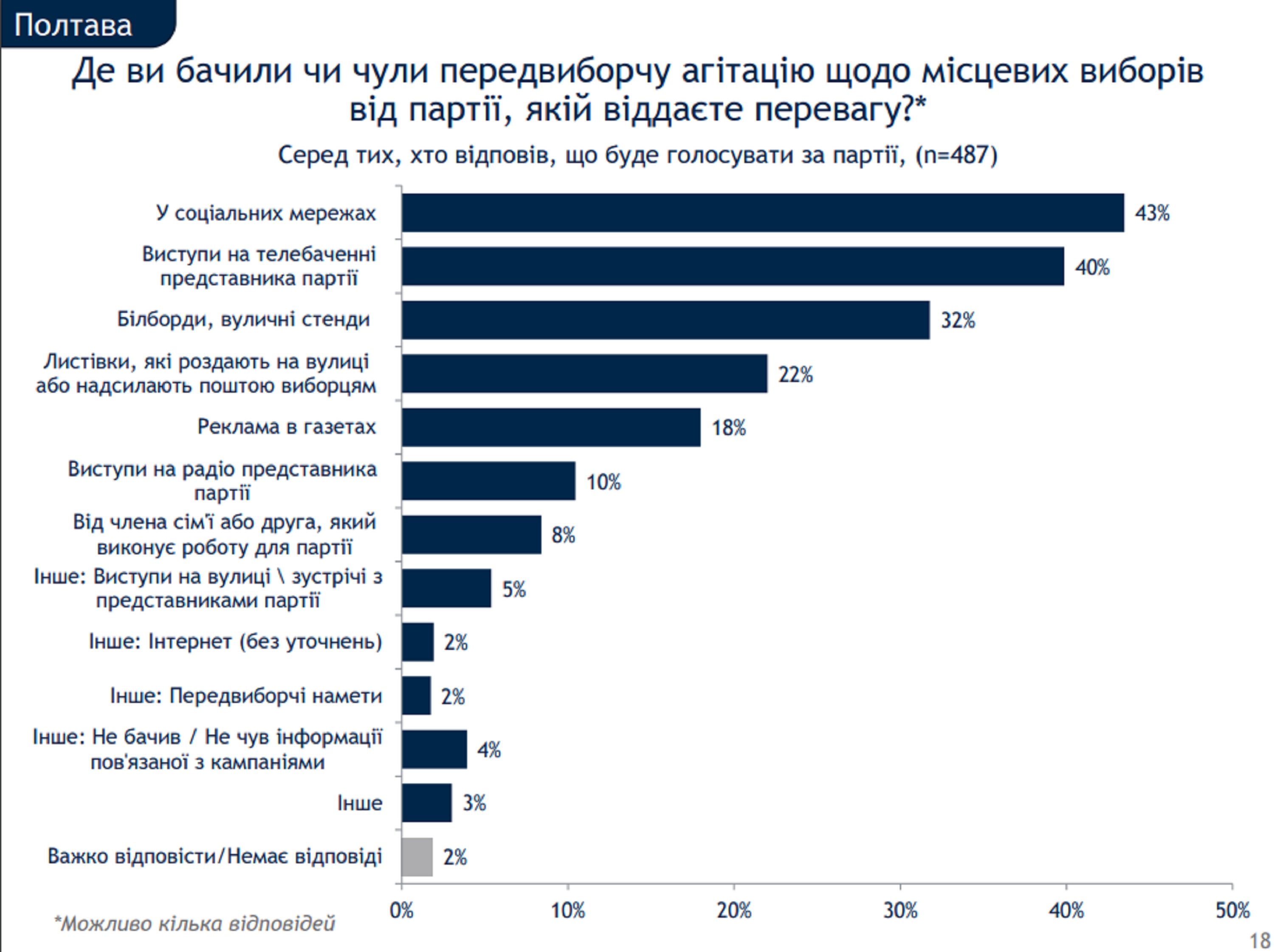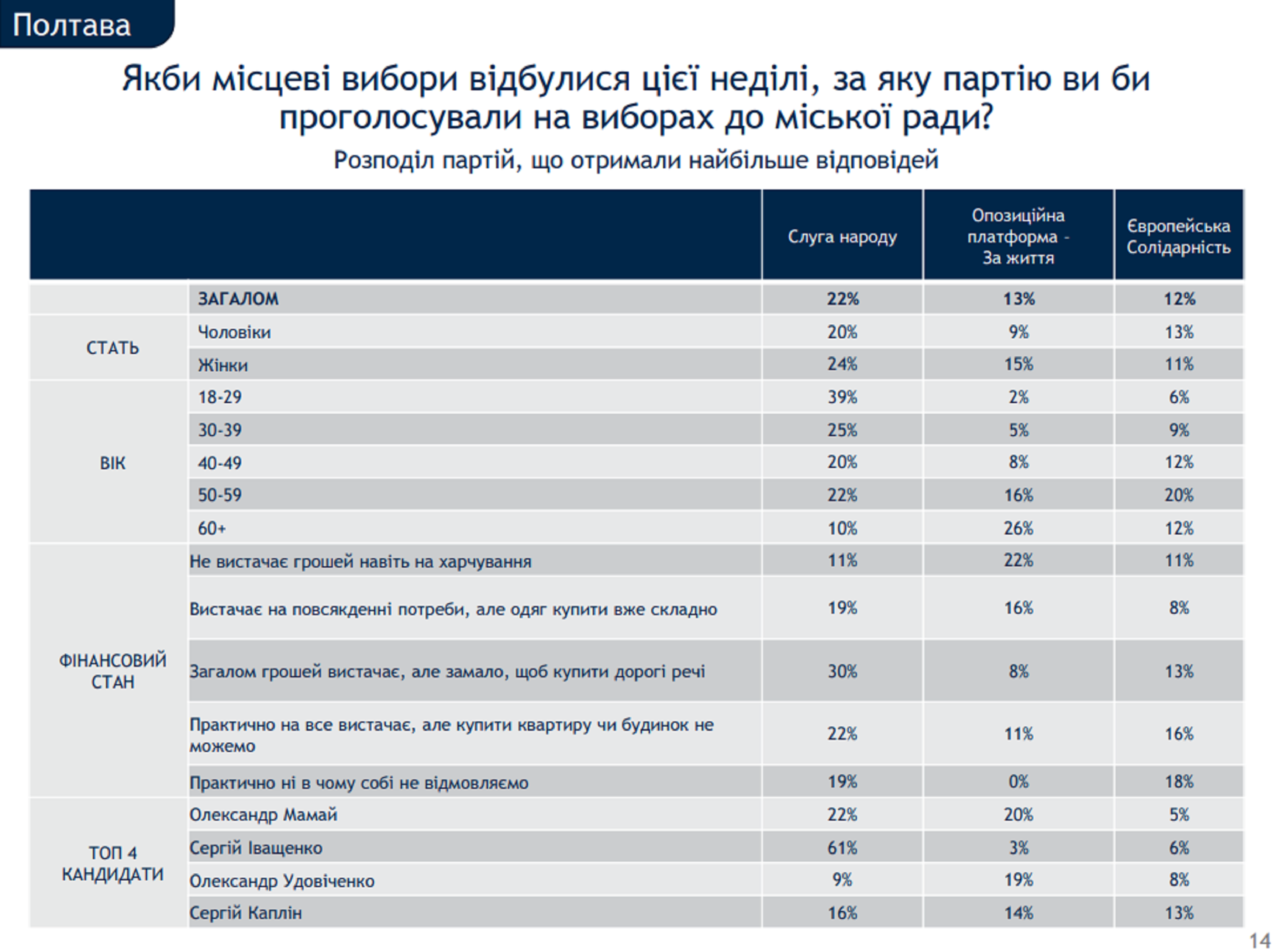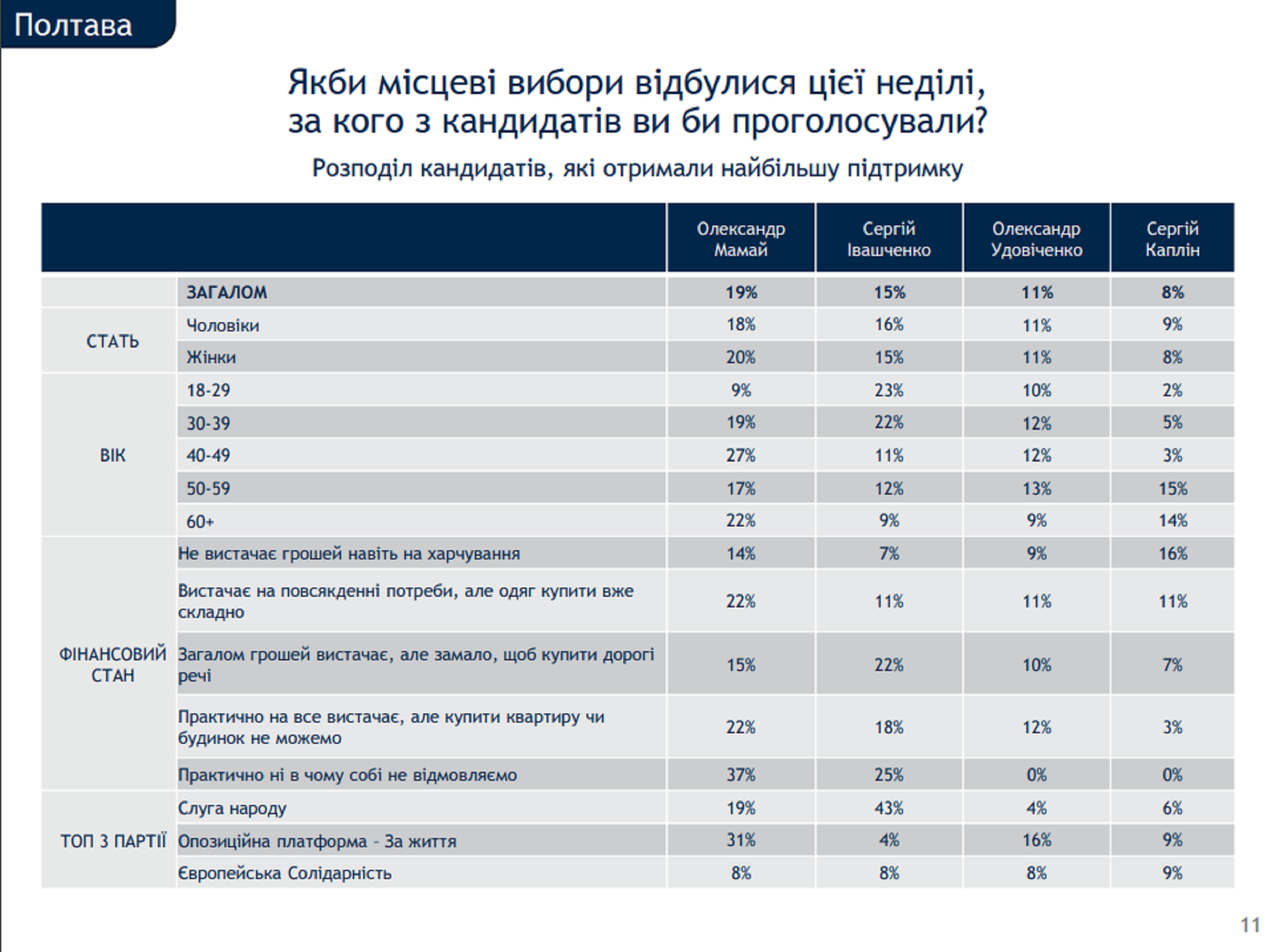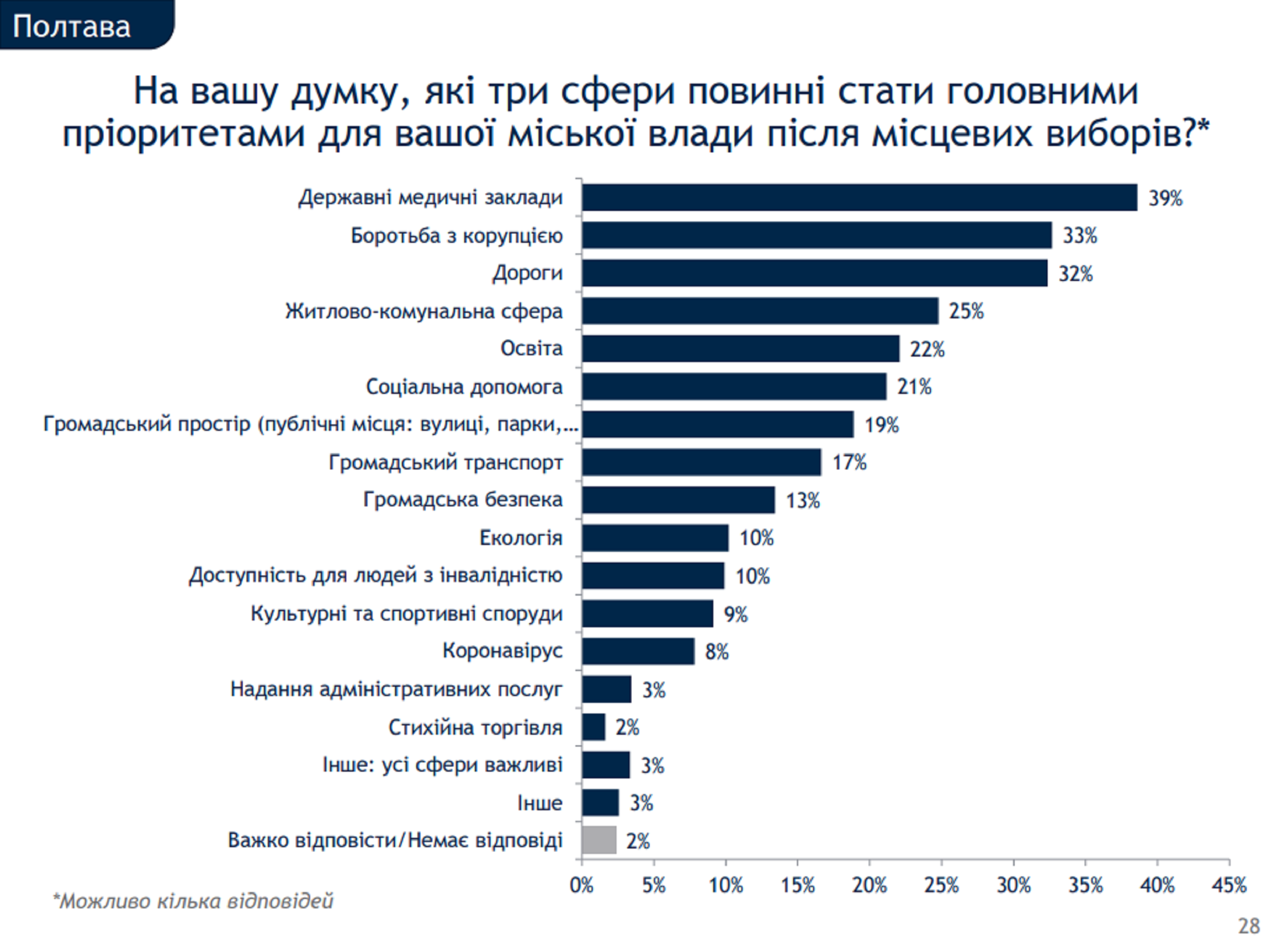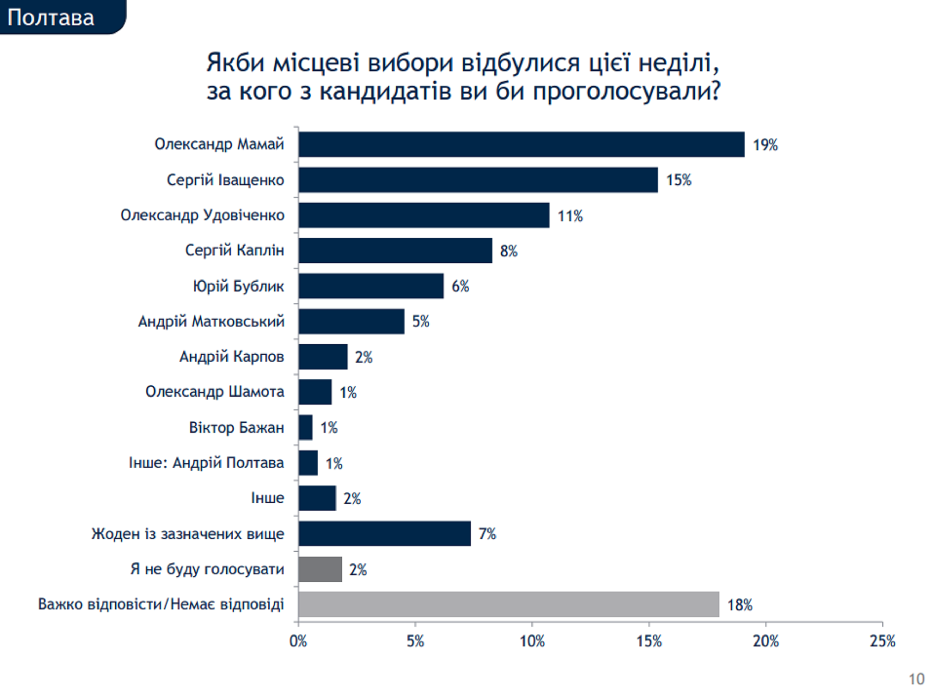Опрос проведен социологической компанией Info Sapiens по заказу Международного республиканского института (IRI). Данные собирались в городе Полтава 24–25 сентября 2020 года методом телефонного интервью (CATI). Размер выборки составляет n = 600 постоянных жителей города в возрасте от 18 лет. Выборка является репрезентативной. Статистическая погрешность не превышает 4%.