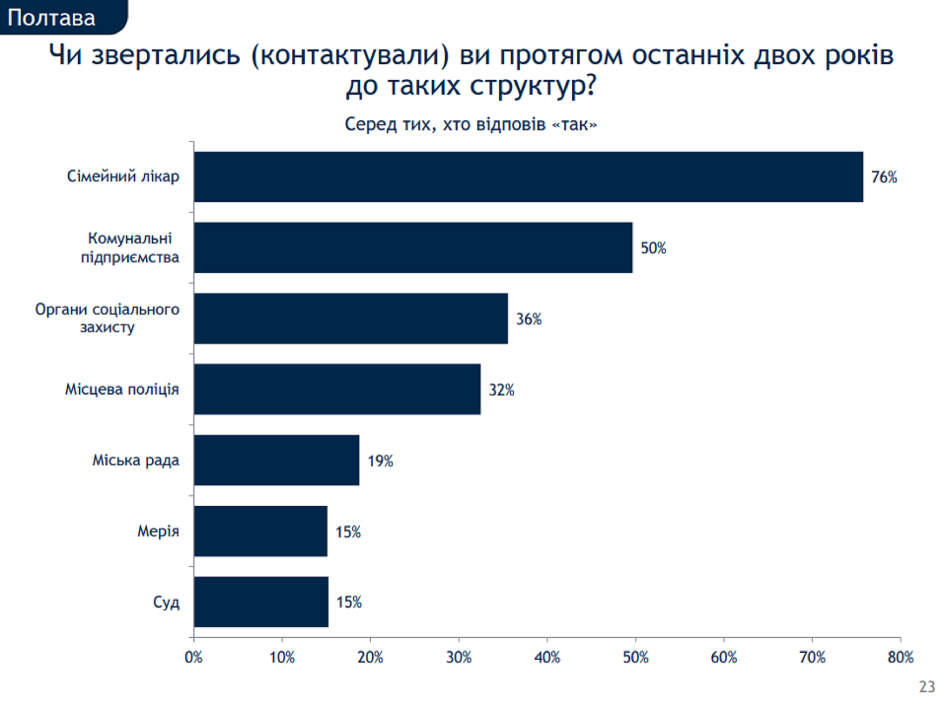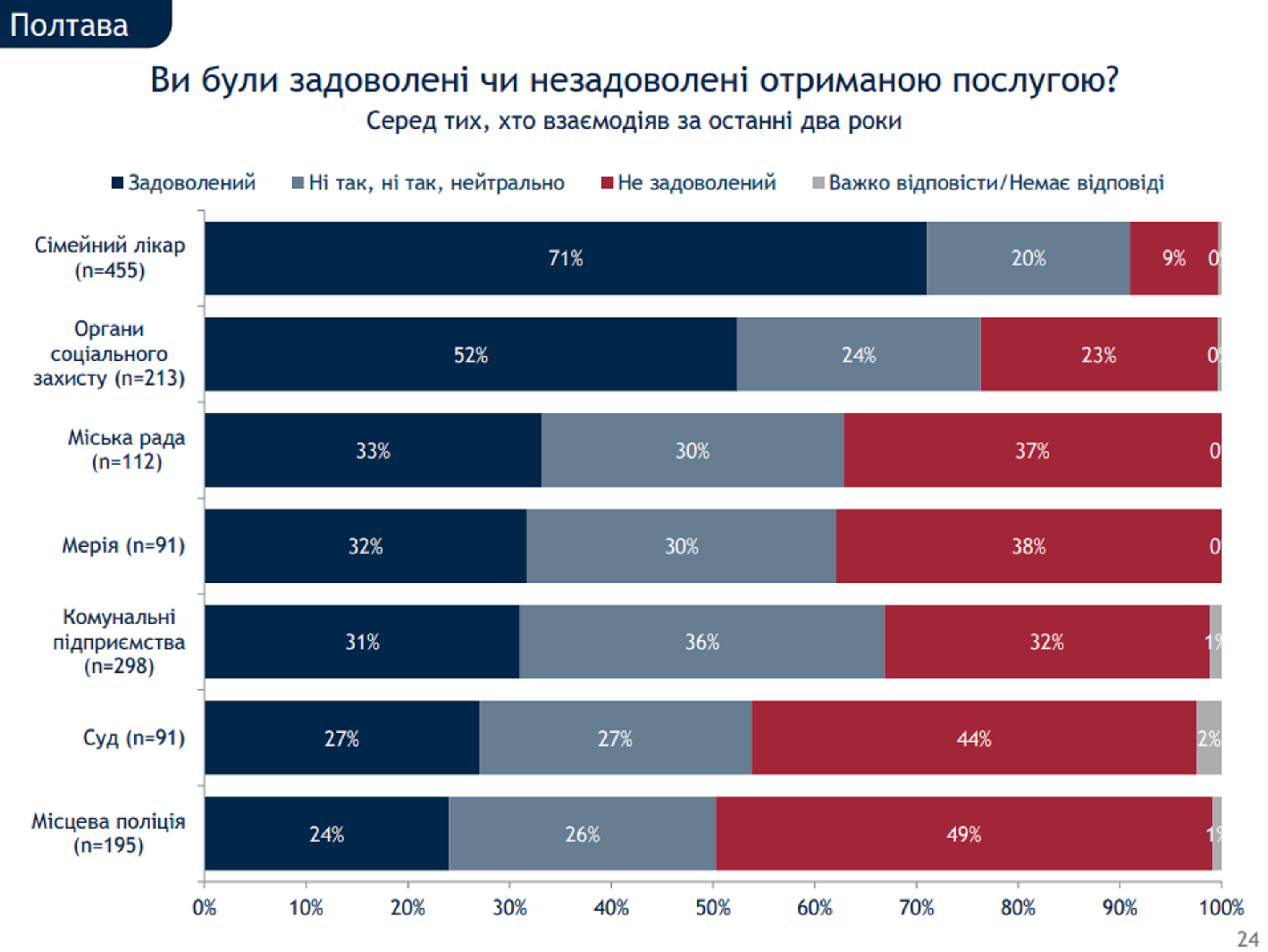 Порядка городу не хватает во всех смыслах. В оценке жителями деятельности полиции город занимает последнее место (10% одобряют ее действия). Возвращаясь домой с наступлением темноты, лишь половина полтавчан чувствуют себя в безопасности.