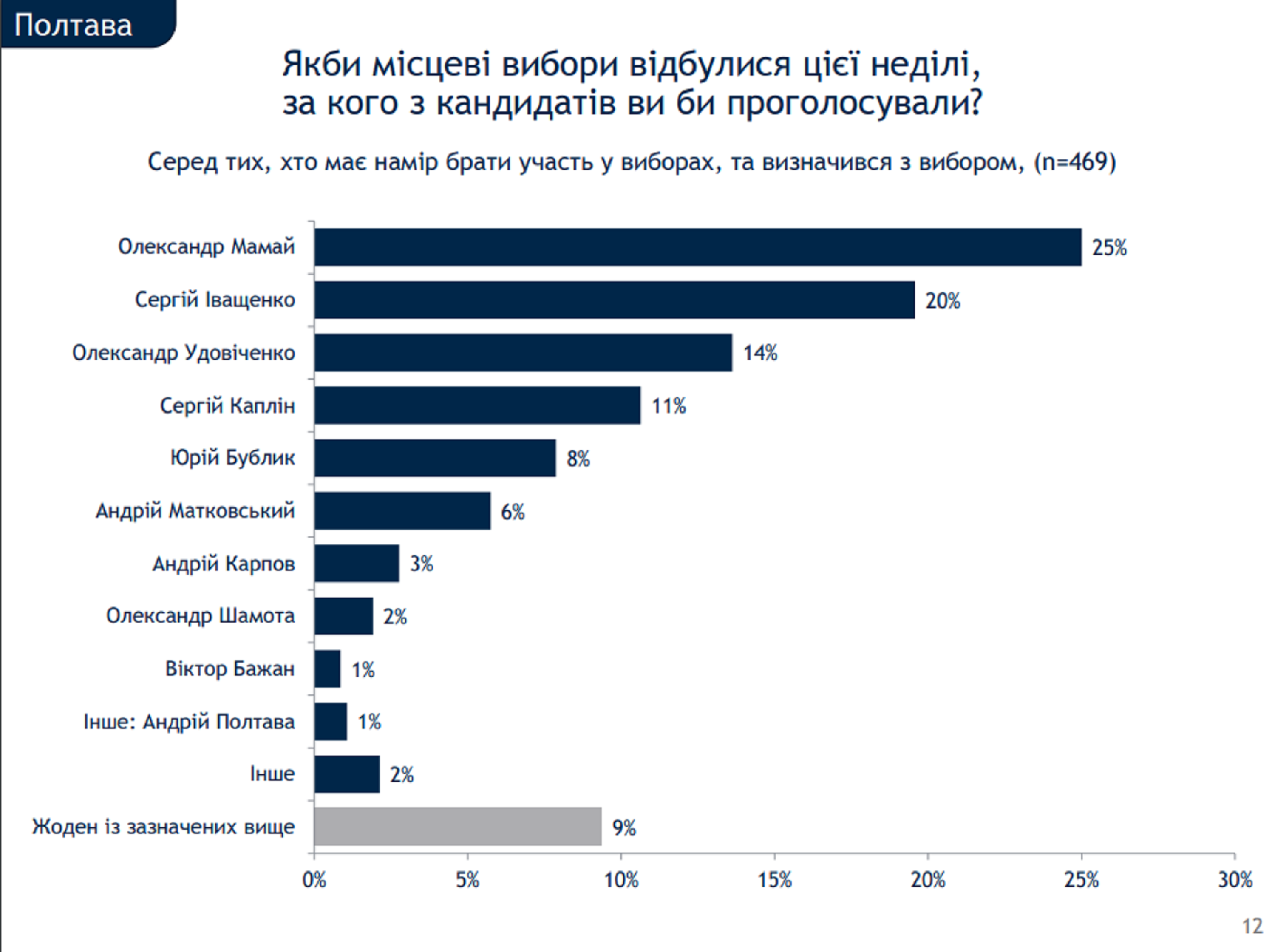 В принципе, набор очень похож на старую раду, включая политические силы двух основных конкурентов Мамая. Как, впрочем, идентична и ситуация. (По данным опроса IRI, проведенного компанией Info Sapiens, у Мамая 25%.) Если пройдет во второй тур и станет мэром — снова может пойти в суд. Компромиссом элит в Полтаве не пахнет.