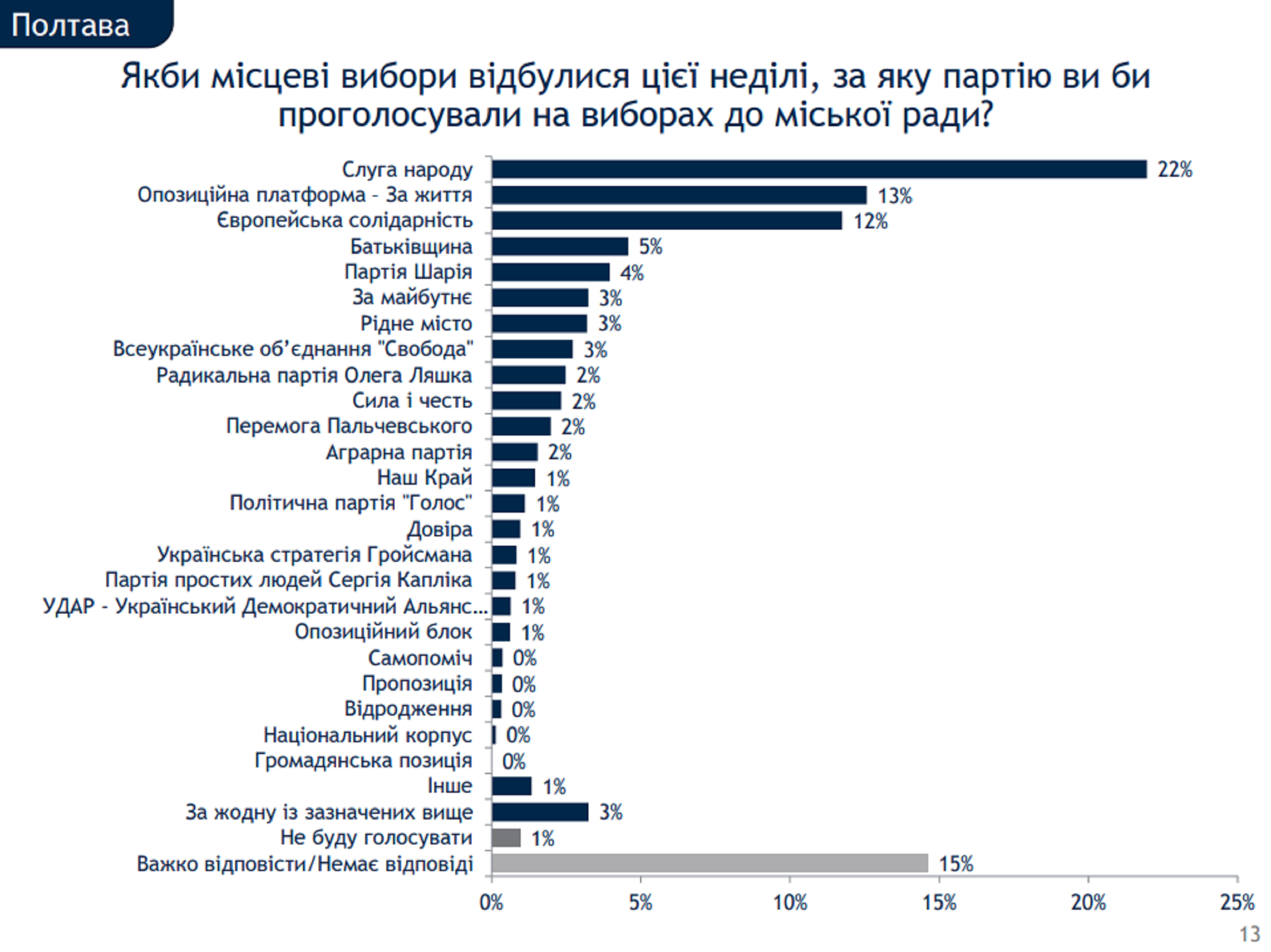 Хотя в Полтаве, как и во многих других украинских городах, партийные бренды вторичны. Первичны договоренности. Ожидается, что в городскую раду пройдут «Слуга народа» (26%), ОПЗЖ (15%), ЕС (14%), «Батьківщина» (5%) и «Рідне місто» (4%). «Свободе» (3%) и «Партии простых людей» (1%) — сложнее.