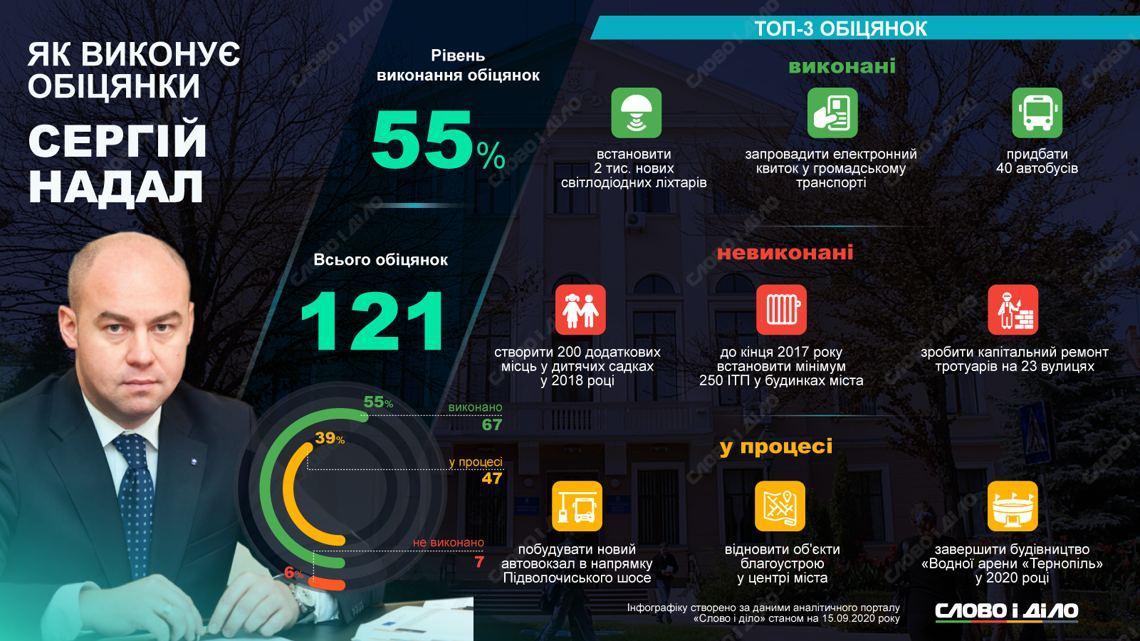 По данным аналитического портала «Слово і Діло», городской глава Сергей Надал за время каденции дал 121 обещание, из которых выполнил 67 (55%), провалил — 7 (6%) и еще 47 (39%) должен реализовать.