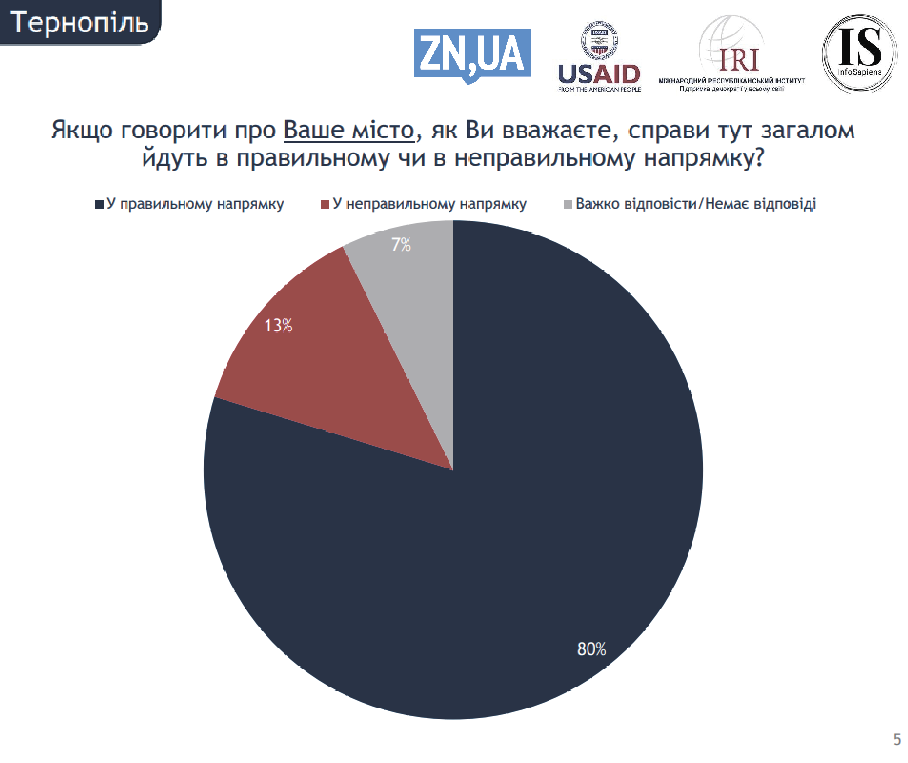 80% горожан убеждены, что их город развивается в правильном направлении, и лишь 13% считают, что это не так. 84% жителей города позитивно оценивают деятельность мэра, а 77% от тех тернопольчан, которые уже определились со своим выбором, отдадут голоса Сергею Надалу.