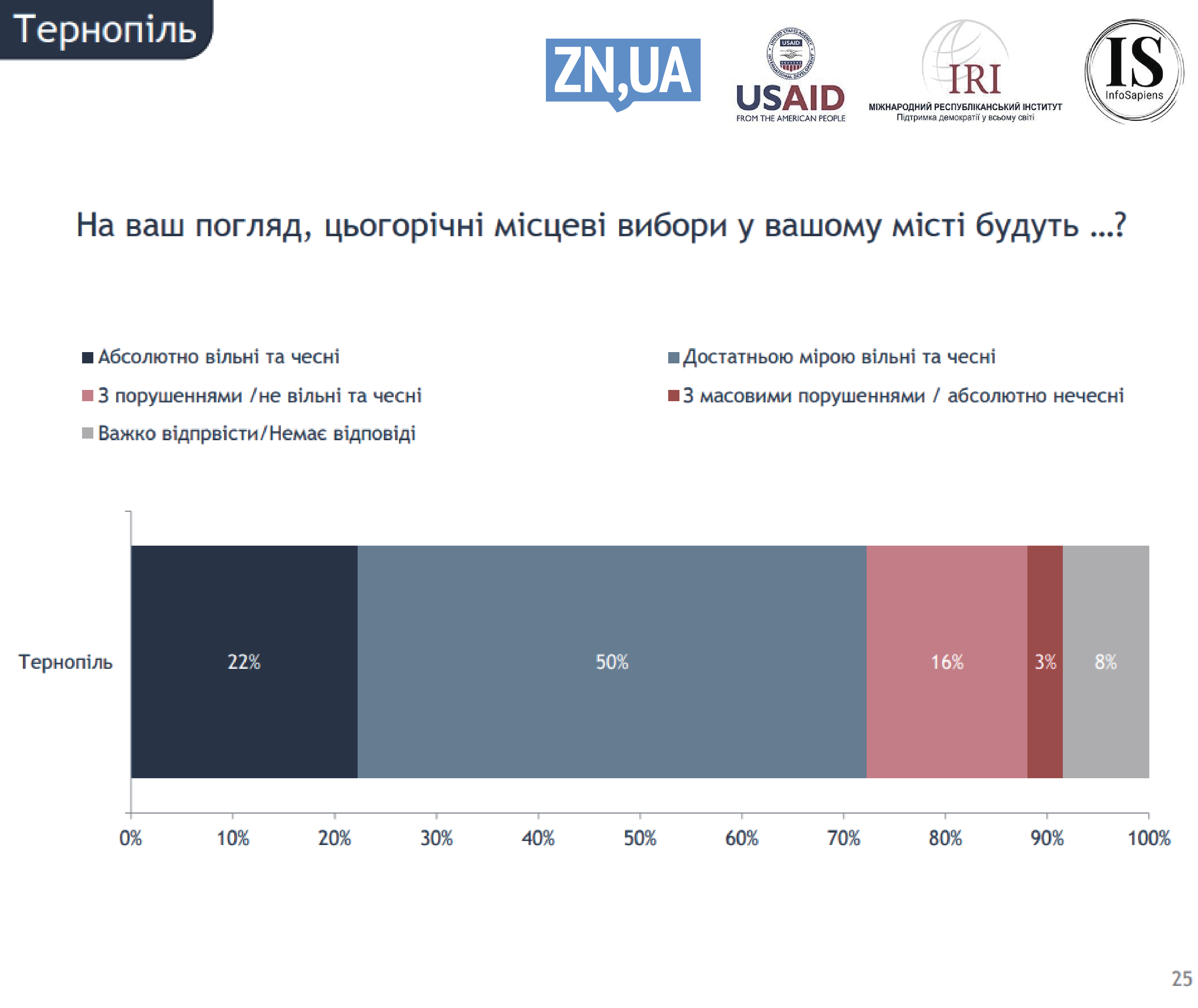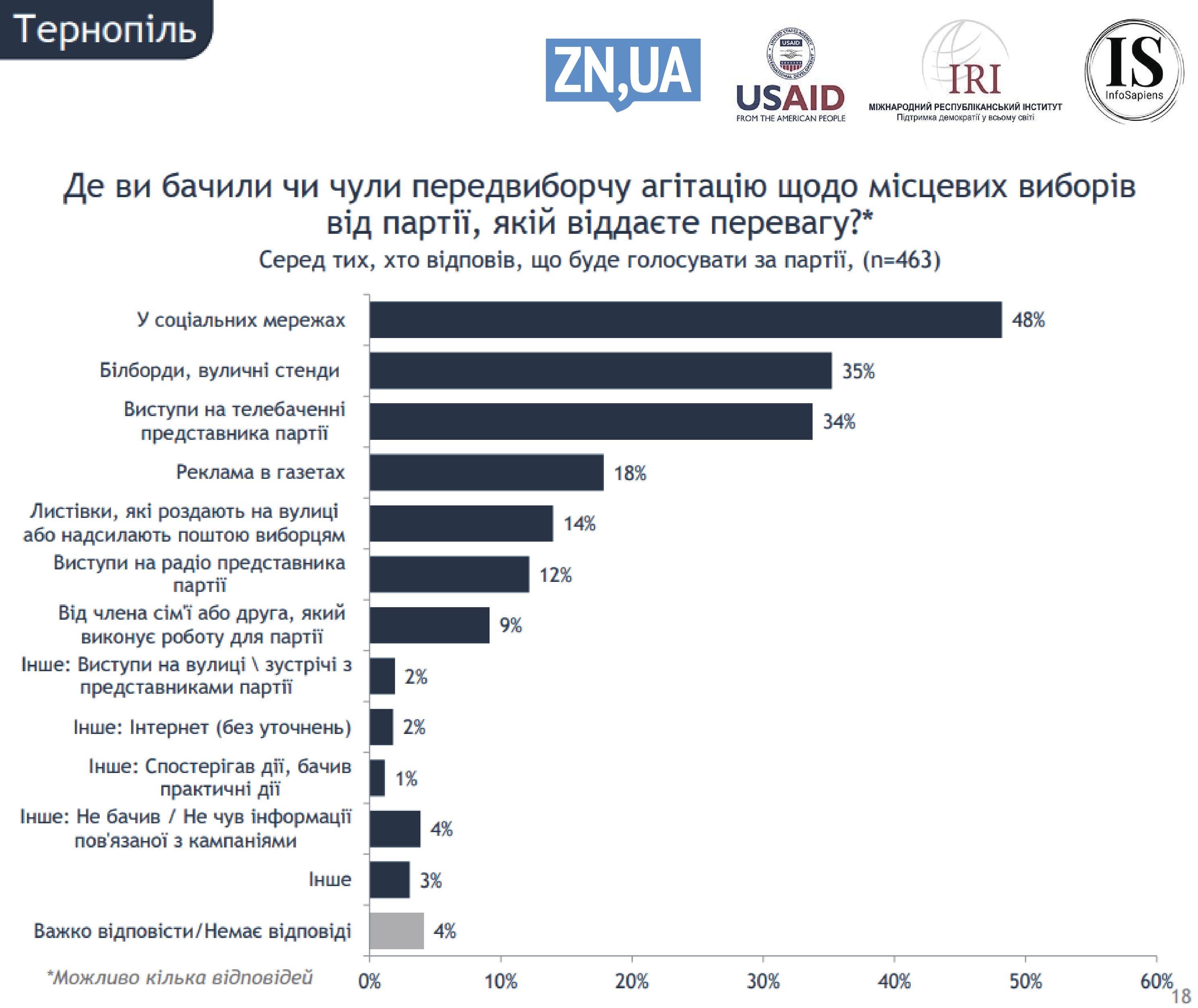 Почти половина (48%) тернопольчан черпают информацию о кандидатах и выборах в социальных сетях, 35% — из наружной рекламы, 34% — из телепередач. Кстати, Тернополь — первый украинский город, настолько внимательный к билбордам. Или люди много работают, и времени у них только на «чтение» билборда, или критическое мышление у трети «на паузе».