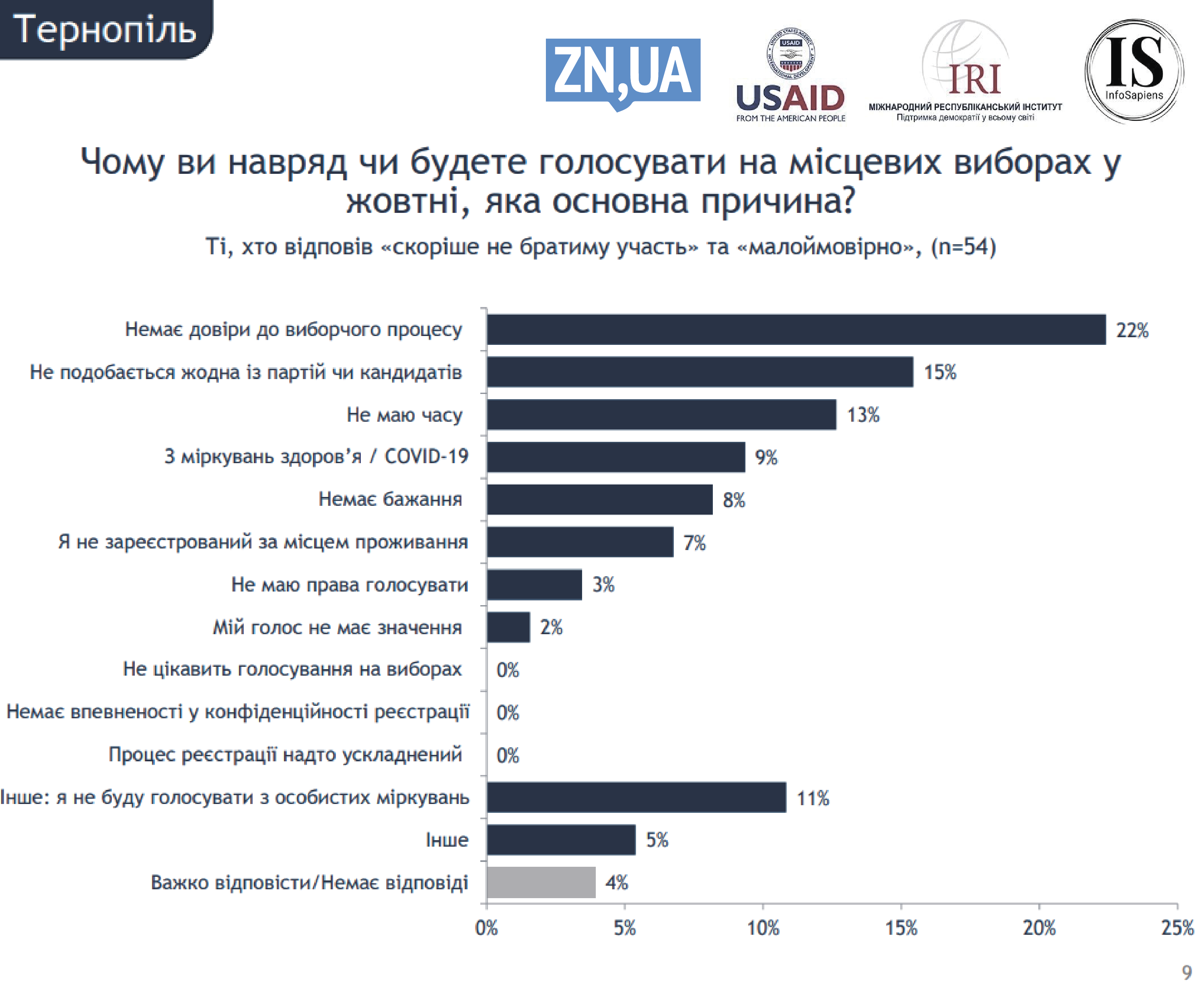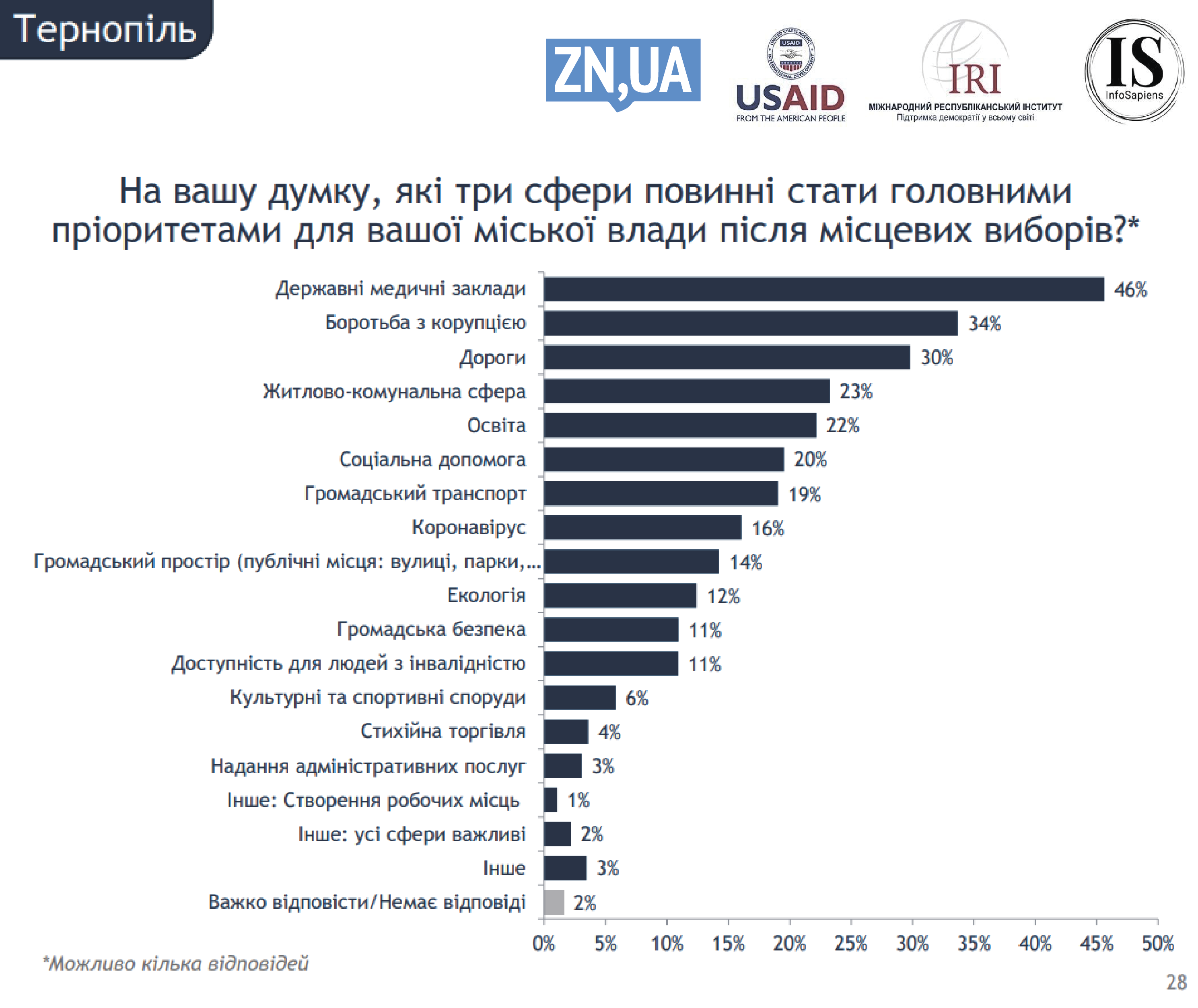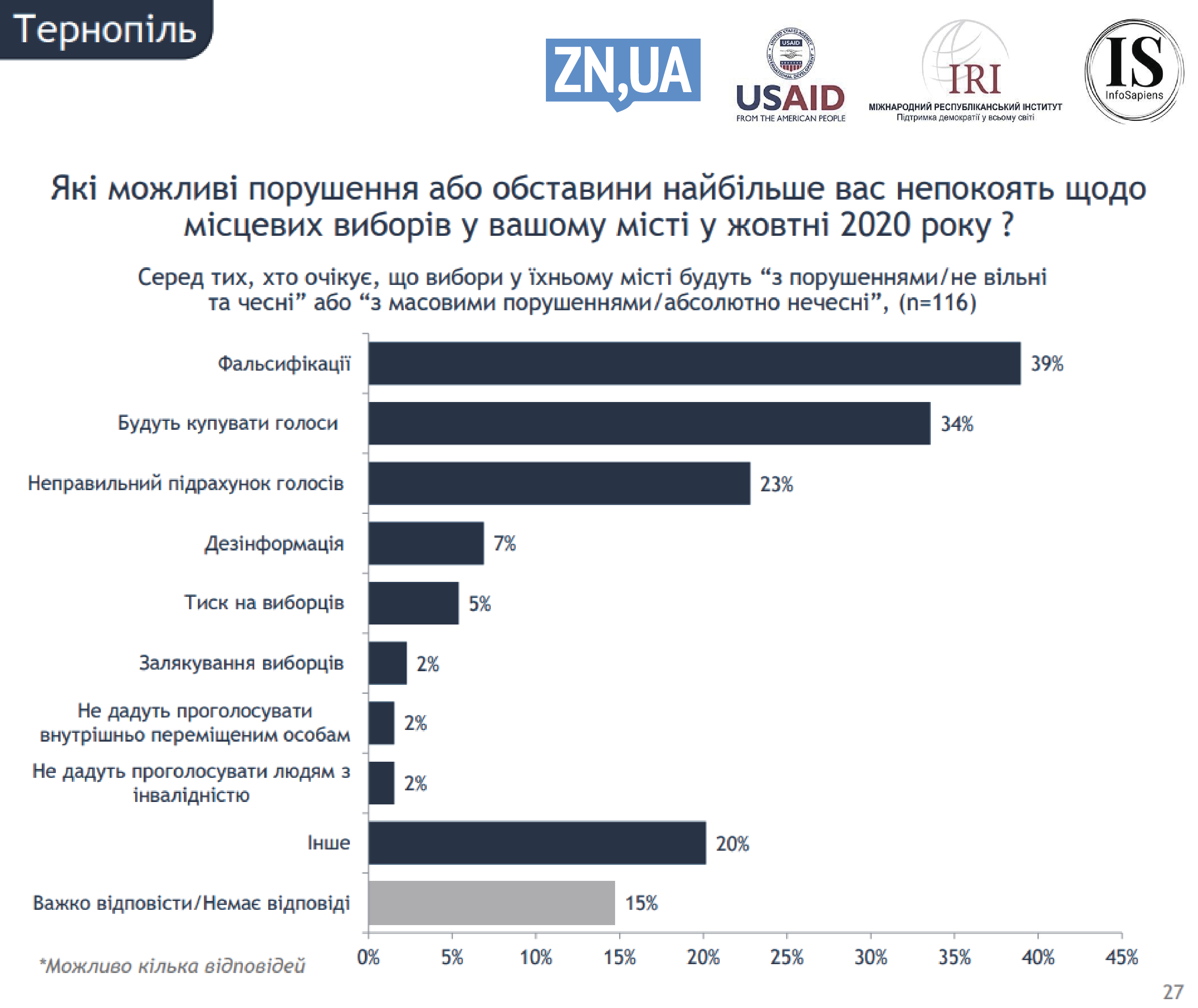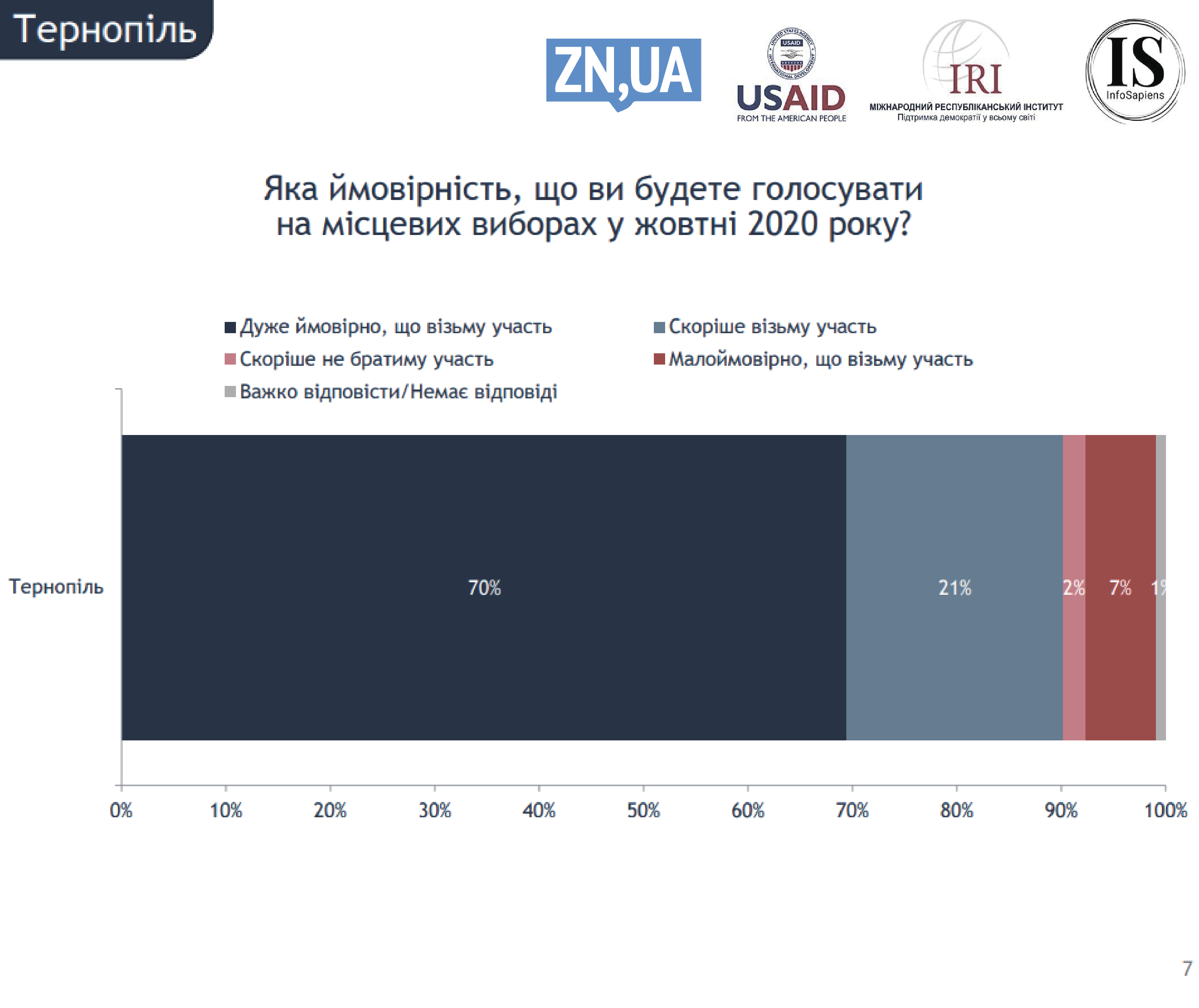 Опрос проведен социологической компанией Info Sapiens по заказу Международного республиканского института (IRI). Данные собирались в городе Тернополь 25–28 сентября 2020 года методом телефонного интервью (CATI). Размер выборки составляет n = 600 постоянных жителей города в возрасте от 18 лет. Выборка является репрезентативной. Статистическая погрешность не превышает 4%.