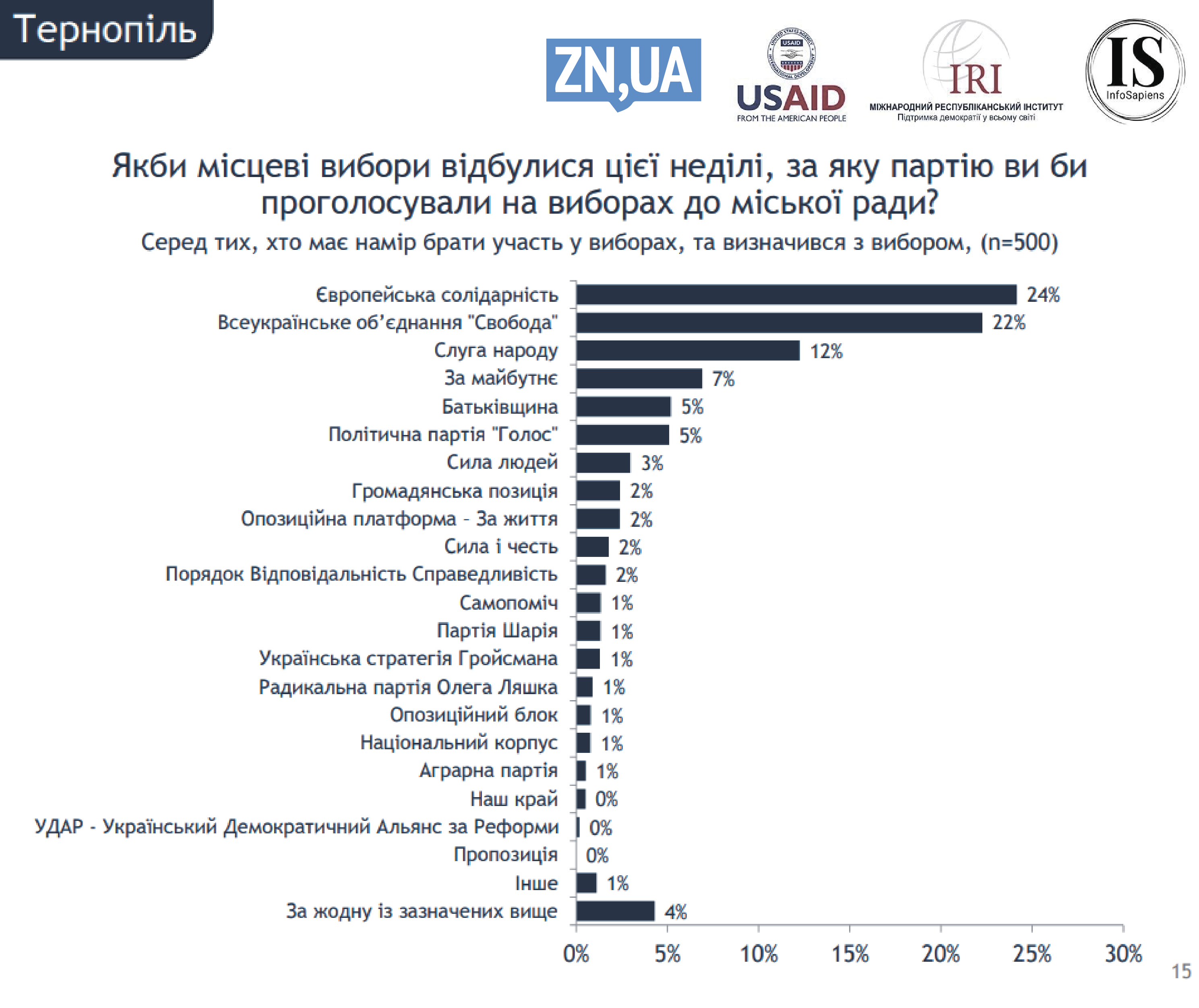 Интересно, что в политическом доме «Свободы» неожиданно неплохо чувствует себя партия власти: у «Слуги народа» 12% (и 33% горожан доверяют президенту Владимиру Зеленскому). С учетом же его недавнего комментария в интервью BBC, что «в первом туре у него где-то столько же и было», то в Тернополе у Зе! точно все ок.