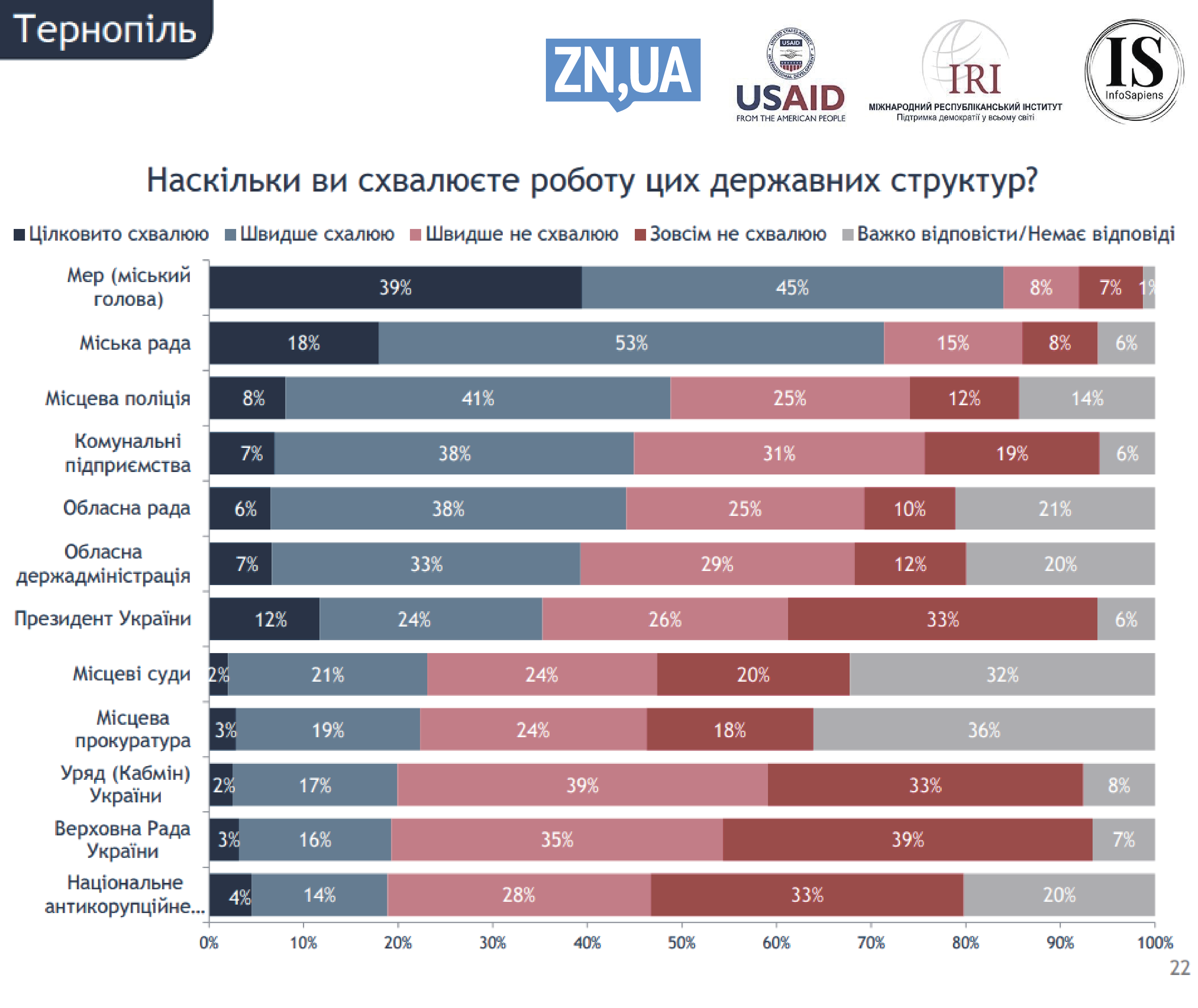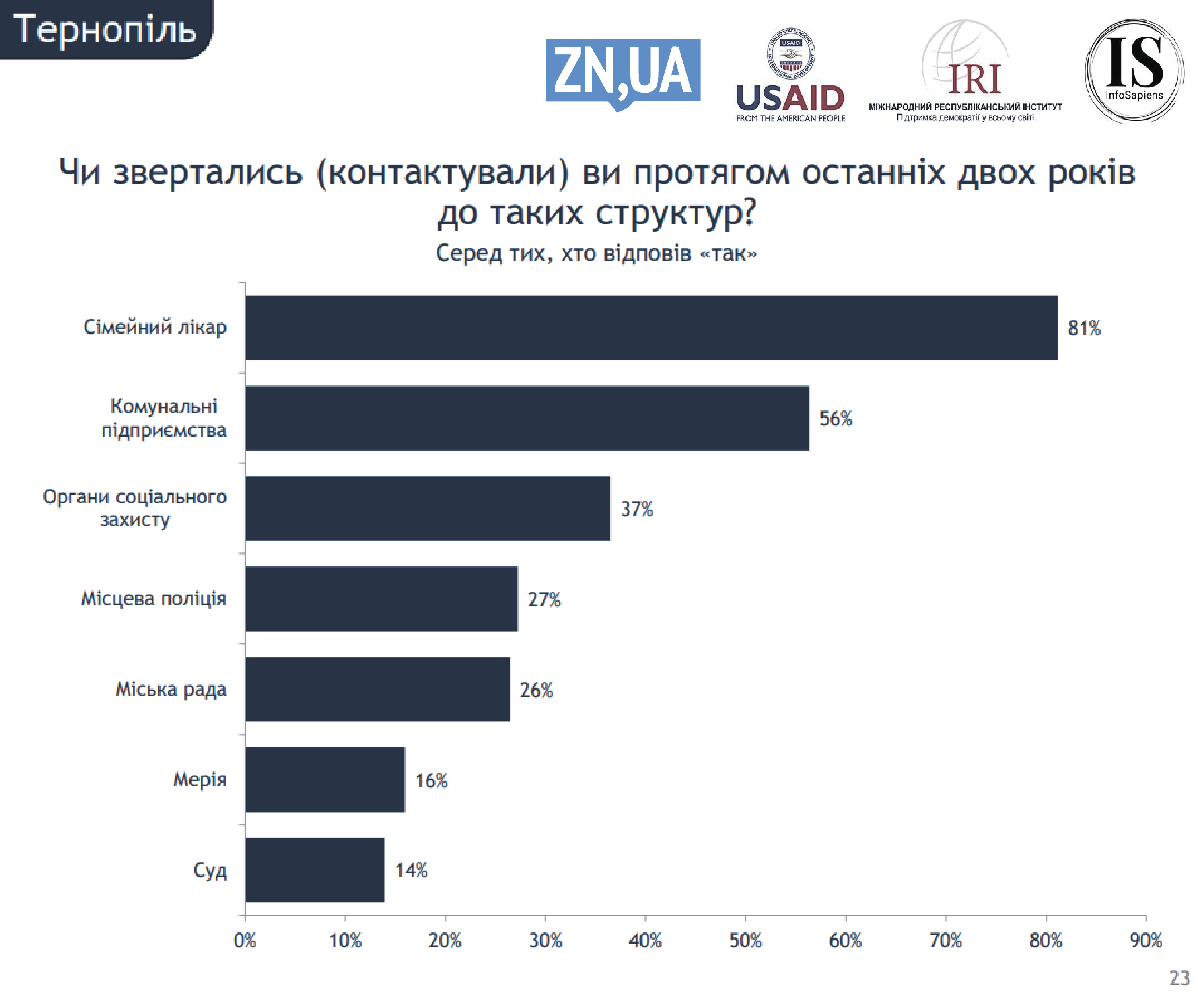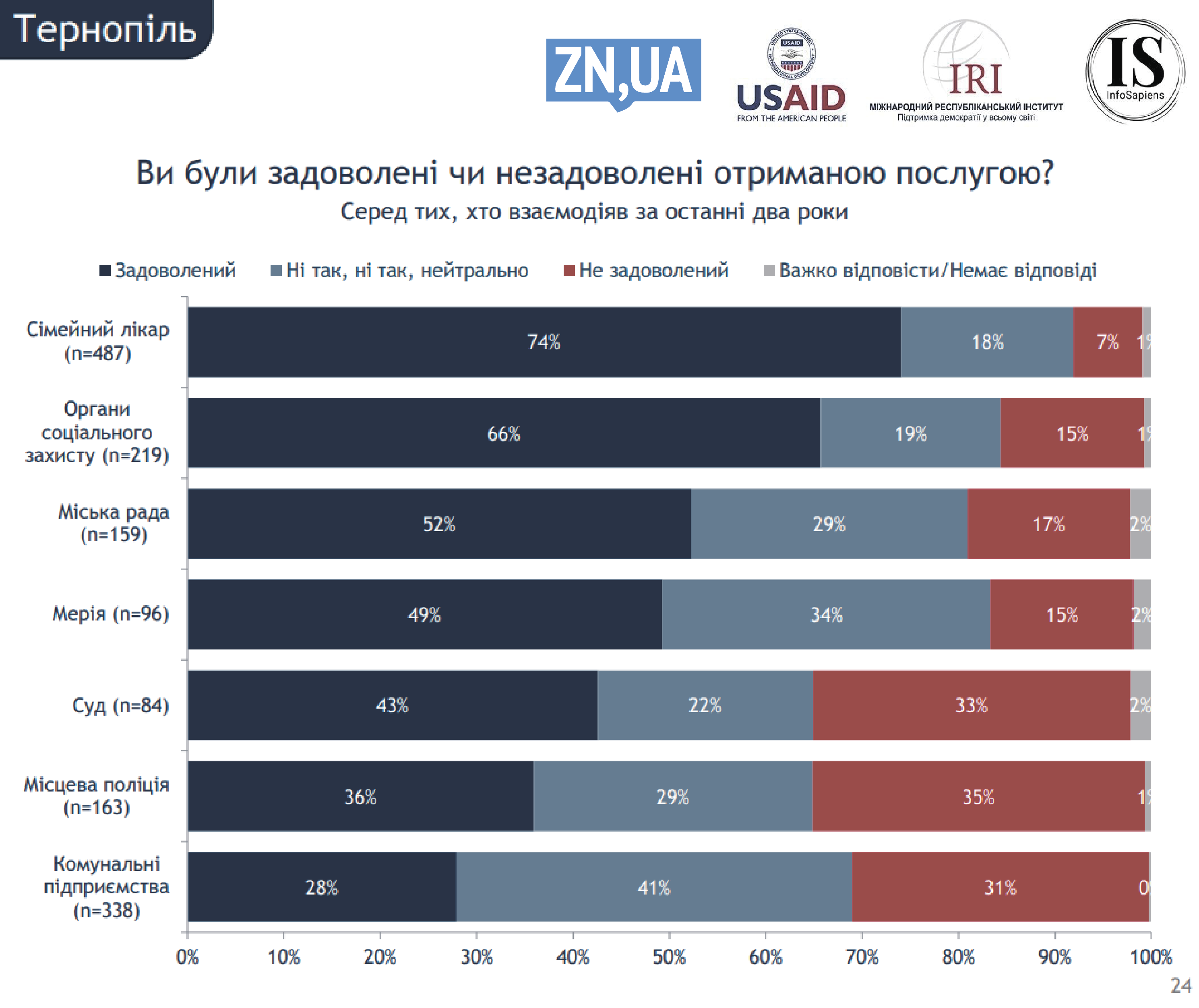 Оценивая уровень качества услуг в городе, его жители были достаточно лояльны к работе местной власти. Здесь Тернополь не пасет задних и, по данным муниципального опроса IRI, проведенного компанией Info Sapiens, набрал 3 балла из 5 возможных, обойдя Киев, Днепр и Одессу.