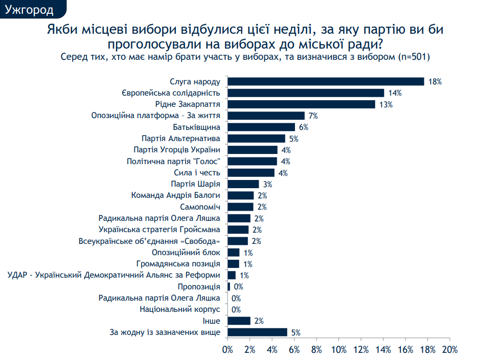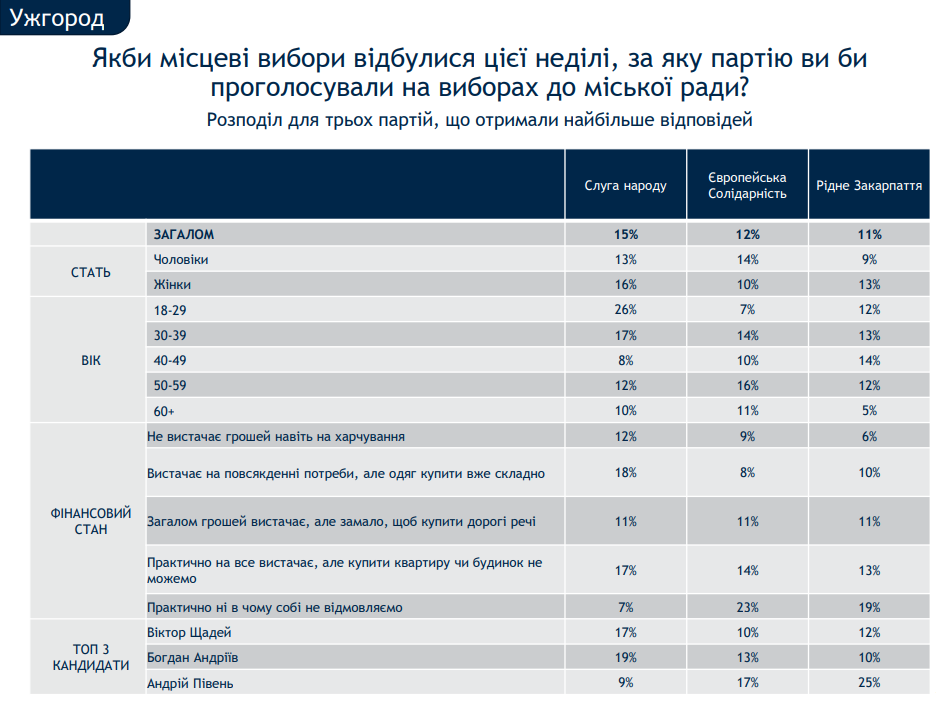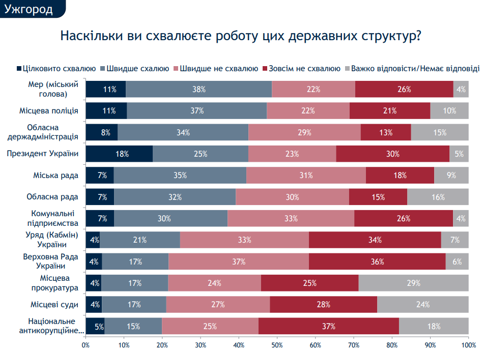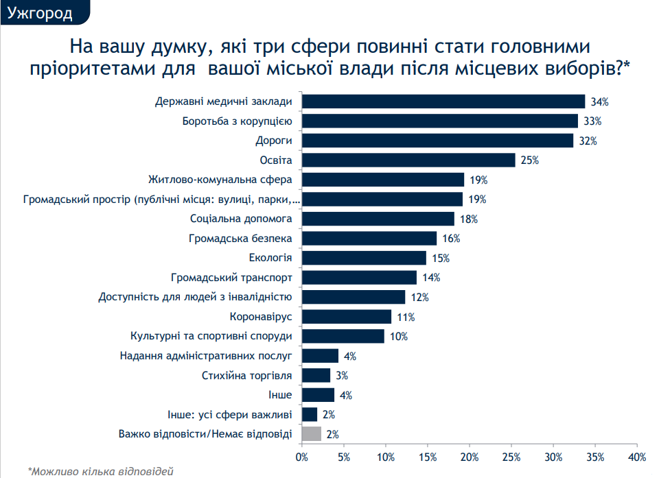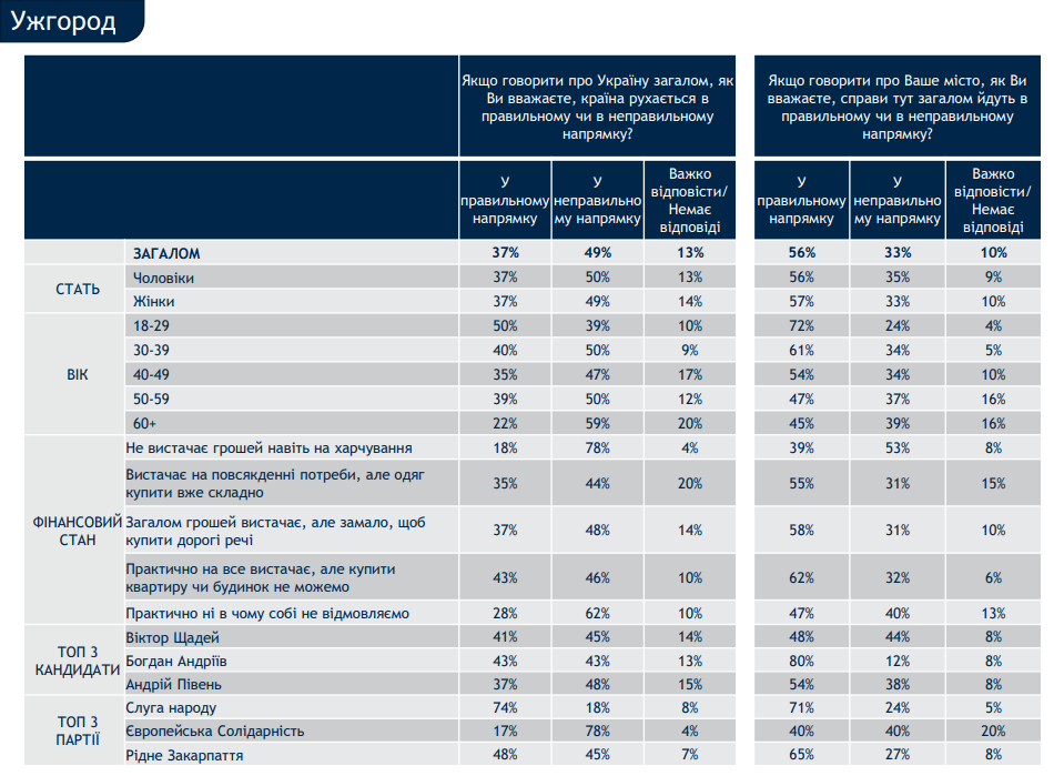 Опрос проведен социологической компанией Info Sapiens по заказу Международного республиканского института (IRI). Данные собирали в Ужгороде 17–19 сентября 2020 года методом телефонного интервью (CATI). Размер выборки составляет n = 600 постоянных жителей города в возрасте от 18 лет. Выборка является репрезентативной. Статистическая погрешность не превышает 4%.