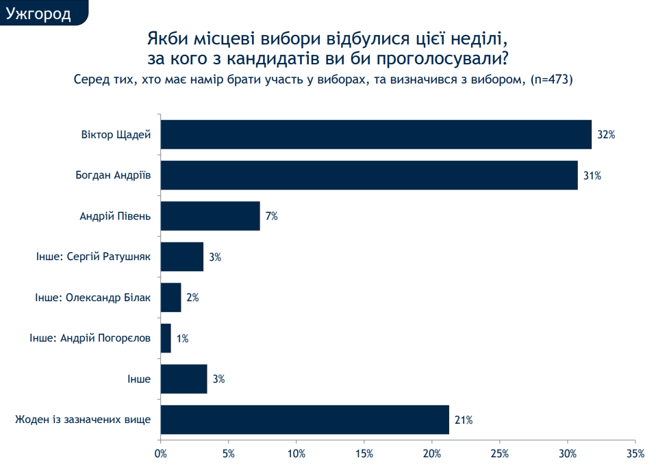Основной конкурент мэра Ужгорода Богдана Андреева — главный революционер и оппозиционер города, а теперь уже и «слуга народа» Виктор Щадей (у него 32%). И они с Андреевым (31%) идут нос в нос. Объединившись с партией власти, Щадей автоматически потерял поддержку патриотического электората столицы Закарпатья. Ответный месседж кандидата, что «президентская партия не даст оппонентам подкупать избирателей», большого отклика в рядах бывших соратников не нашел.