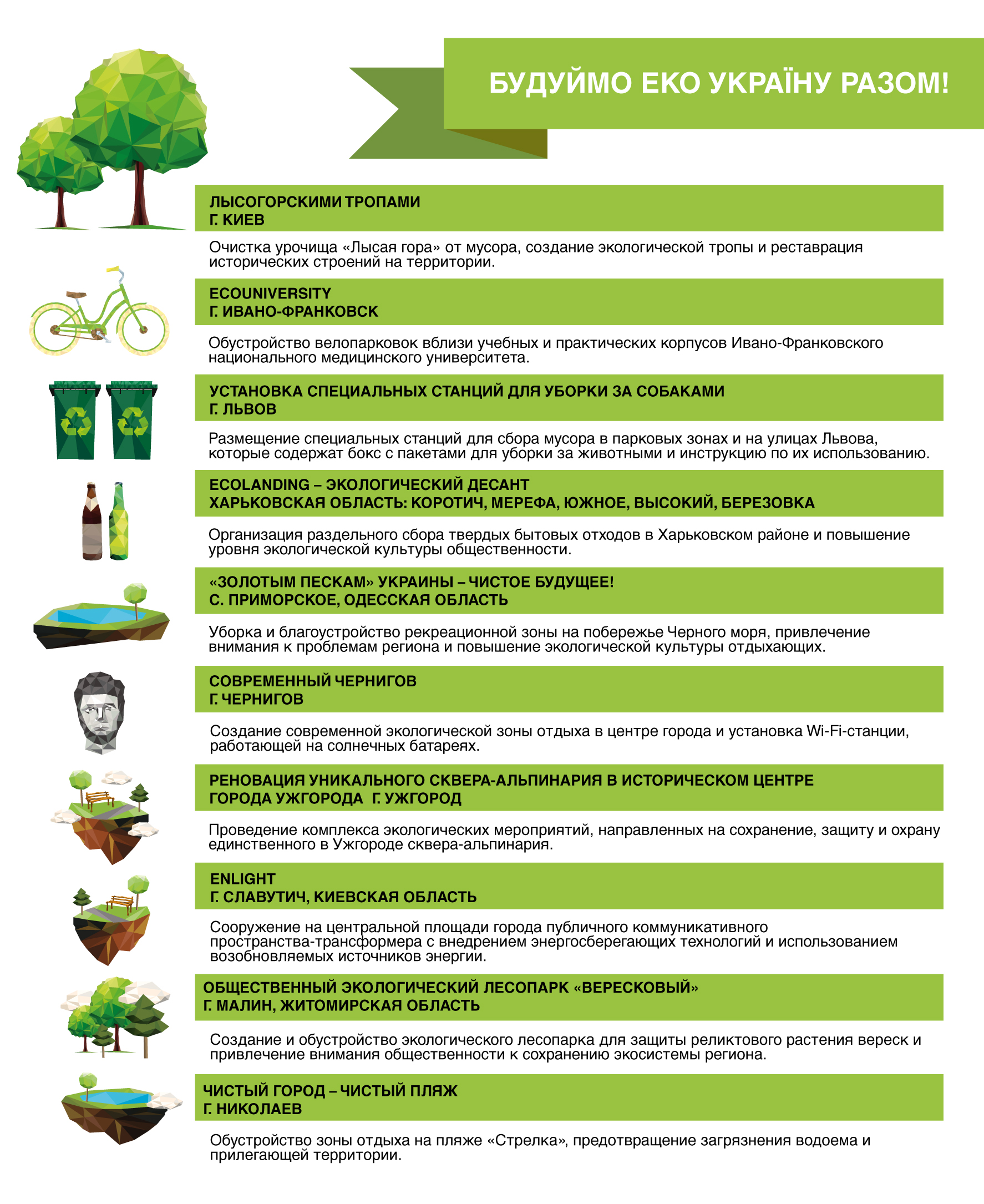 По результатам голосования жюри в список победителей вошли: "Чисте місто − чистий пляж" (Николаев), "Enlight" (Славутич, Киевская обл.), "Лисогірськими стежками" (Киев), "Сучасний Чернігів" (Чернигов), "Встановлення спеціальних станцій для прибирання за собаками" (Львов), "Ecolanding − екологічний десант" (Харьковская обл.), "Золотим піскам" України – чисте майбутнє!" (с. Приморское, Одесская обл.), "Ecouniversity" (Ивано-Франковск), "Громадський екологічний лісопарк "Вересковий" (Малин, Житомирская обл.), "Реновація унікального скверу-альпінарію в історичному центрі міста Ужгород" (Ужгород).
