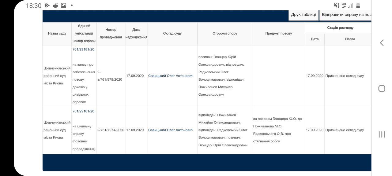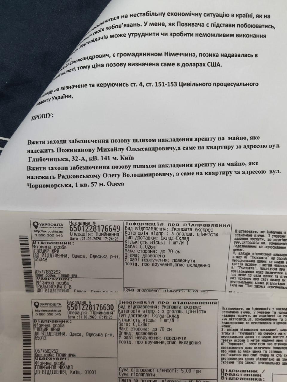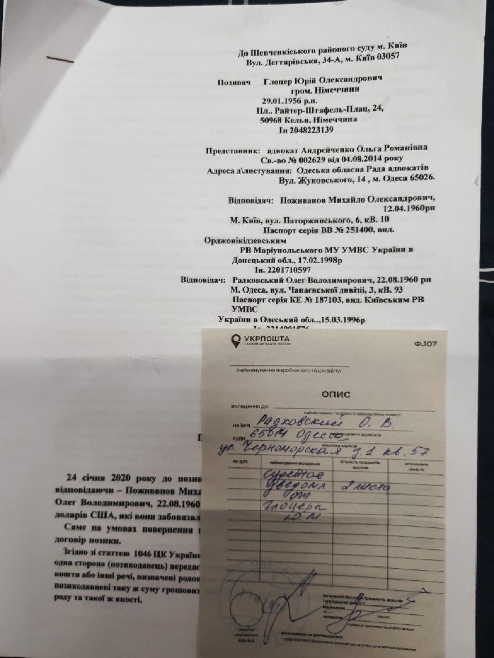 Юристы крупного бизнесмена, одного из основных бенефициаров банка «БФГ-кредит» Юрия Глоцера подали иск на первого зам главы Одесского облсовета Олега Радковского и бывшего мэра Мариуполя, кандидата на пост мэра Киева Михаила Поживанова в Шевченковский районный суд г. Киева, который принял этот иск к производству. В иске указывается, что названые лица мошенническим путем завладели имуществом ТОВ «Горбушка» в Одессе. Представители истца утверждают, что Радковский и Поживанов взяли деньги в долг у Глоцера, однако не вернули их. Для обеспечения иска юристы просят наложить арест на имущество этих лиц. В свою очередь, ответчики утверждают, что часть денег они передали действующему меру Одессы Геннадию Труханову. Последний вызывается в суд в качестве свидетеля.