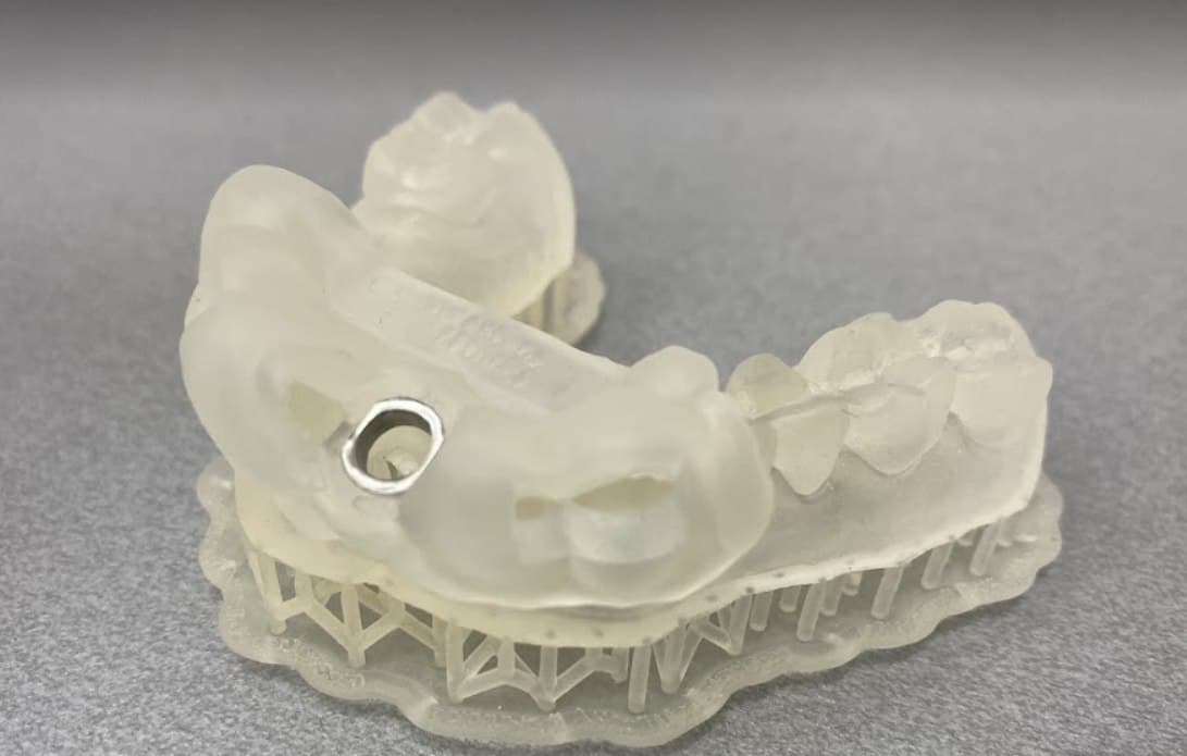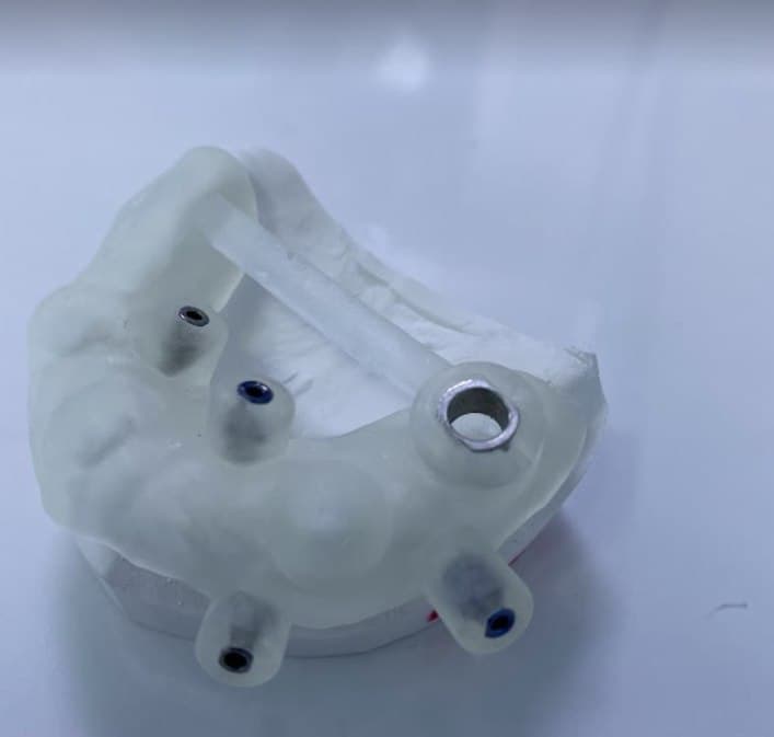 Данные программы передаются на 3D принтер, где создается хирургический шаблон из полимерного материала. Во время проведения фактической операции полученный шаблон устанавливается в полость рта пациента, напоминая съемные протезы. С помощью специальных гильз врач готовит направления в костной ткани для последующей установки имплантов. После процедуры шаблон удаляется.