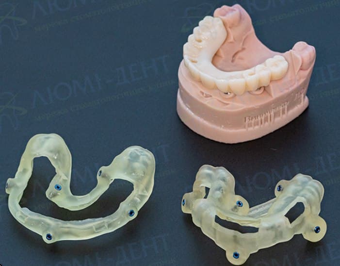 Речь идет о хирургических шаблонах. Стоматологическая клиника Люми-Дент предлагает услуги с применением указанного выше инструмента. Шаблон – это полимерная каппа, изготовленная на основе 3D снимков челюсти пациента. Внутри этого шаблона есть специальные гильзы, обозначающие порядок введения имплантата в кость.