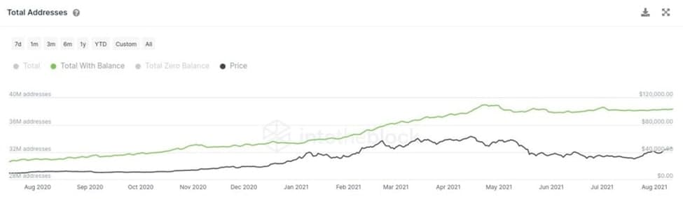 По данным статистического портала IntoTheBlock, количество биткоин-адресов с ненулевым балансом за последний год увеличилось на 7,3 млн. Состоянием на 11 августа 2020-го эта цифра составляла 30,93 млн.