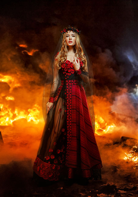 Еще одна вещь, которой Людмила Бушинская привлекла к себе внимание - платье, созданное для Мисс Украины Вселенной-2014. Называлось оно "Невеста войны". Два цвета: черный и красный. Расшитое маками и сотнями кристаллов. "Это был настоящий крик души, - говорит дизайнер, - мой способ донести миру трагизм событий, которые сегодня происходят в нашей стране".
