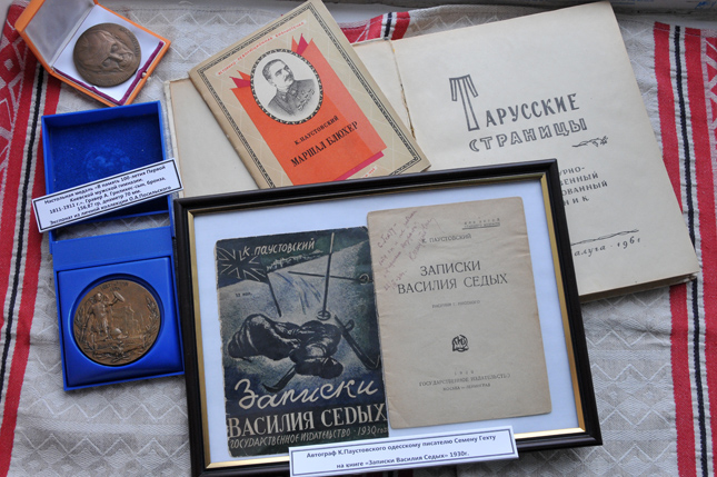Есть в музее и уникальная бронзовая медаль, учрежденная к 100-летию Паустовского. И юбилейная медаль, выпущенная к 100-летию классической Киевской первой гимназии. И книги писателя, изданные в 20-е и 30-е годы. И кованая "золотая роза". И изданная в 1930 году книга "Записки Василия Седых" с автографом Паустовского, адресованная его большому другу Семену Гехту. И настоящие раритеты: очерк К.Паустовского "Маршал Блюхер", изданный тиражом в 100 тысяч экземпляров в апреле 1938 года. (В октябре 1938-го Блюхер был арестован и расстрелян. Книгу изымали не только в библиотеках, из дома в дом ходили "спецуполномоченные по изъятию книг врагов народа".) И сборник "Тарусские страницы", принадлежавший писателю.