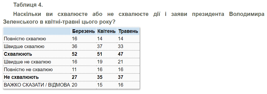 Действия и заявления президента Владимира Зеленского в апреле-мае этого года одобряют 47% граждан, говорится в результатах опроса, проведенного Киевским международным институтом социологии. Не одобряют действия и заявления главы государства 37% граждан.