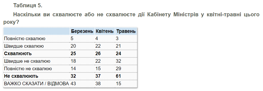 Действия Кабинета министров Украины одобряют 24% респондентов. При этом не одобряют действия украинского правительства 61% опрошенных.