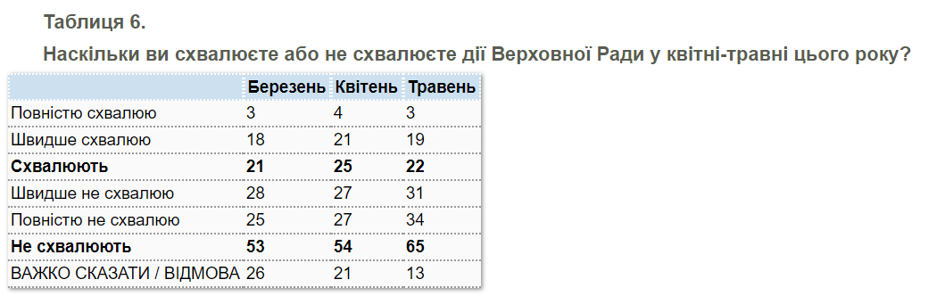 Если говорить о Верховной Раде, то ее действия одобряют 22% украинцев. Не одобряют действий парламента 65% граждан.