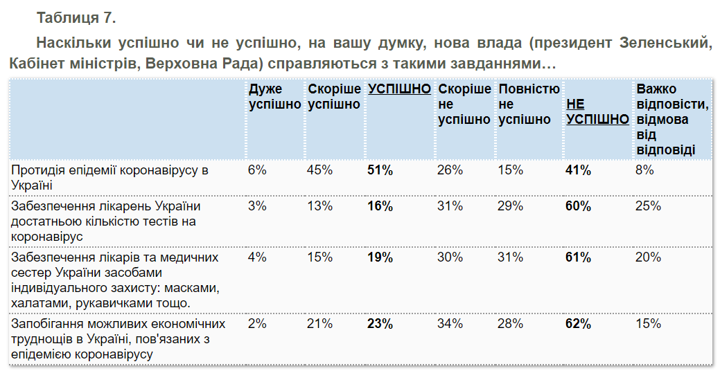Мысли о том, что власть успешно справилась с обеспечением медиков Украины средствами индивидуальной защиты, придерживаются 19% респондентов. Еще 61% граждан считает иначе.
