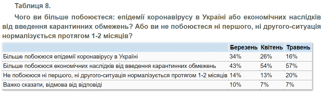 При этом 57% граждан больше боятся экономических последствий от введения карантина, чем эпидемии коронавируса. Еще 16% больше боятся эпидемии COVID-19. Ни того, ни другого не опасаются 20%. Такие украинцы считают, что ситуация нормализуется в течение 1-2 месяцев.
