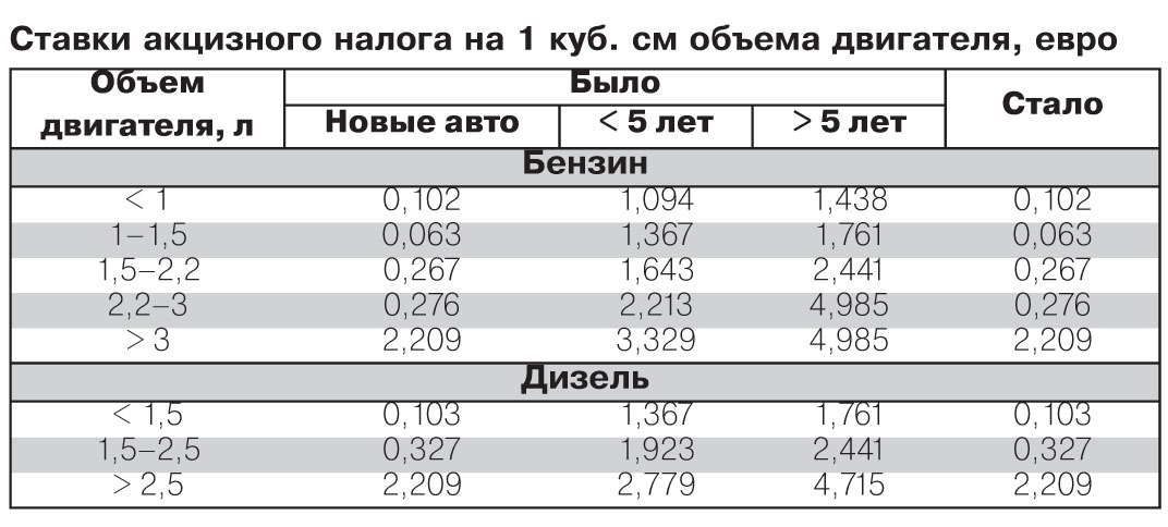 Относительно автомобилей с дизельным двигателем: ставки акцизного налога уменьшены в 6–17 раз для автомобилей с двигателем объемом до 2,5 литра и в 1,5–2,1 раза - для автомобилей с двигателем объемом более 2,5 литра.