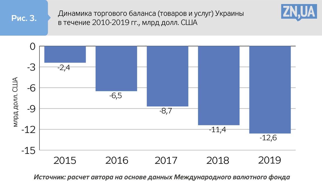 Стагнация экспортного потенциала усиливает проблемы с платежным балансом, подрывая основы для валютно-курсовой и макроэкономической стабильности в стране. Темпы роста импорта преобладают над соответствующими темпами роста экспорта. По данным НБУ, отрицательное сальдо в торговле товарами в Украине в течение 2015–2019 годов увеличилось с 2,5 млрд долл. до 12,6 млрд (см. рис. 3).