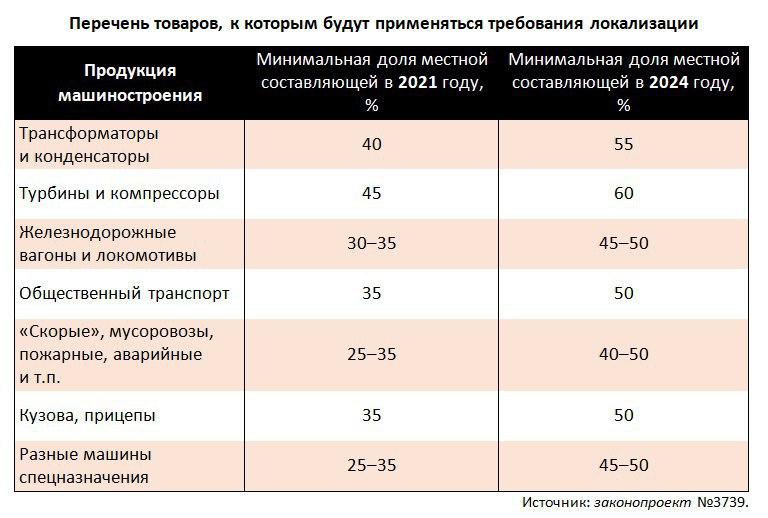 При этом следует отметить, что в случае внедрения условий локализации для удовлетворения потребностей государства в наземном транспорте, энергетическом оборудовании, коммунальной и специальной технике будет привлечено около 4 тысяч отечественных предприятий в сфере машиностроения, а также почти 5 тысяч предприятий в смежных отраслях и видах экономической деятельности.