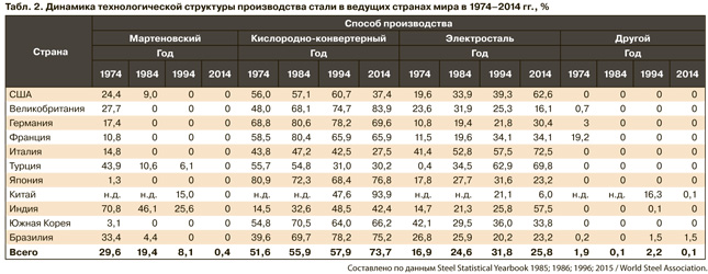 Основной предпосылкой усиления конкуренции на мировом рынке металлопродукции стала масштабная модернизация металлургических предприятий в странах с рыночной экономикой, проведенная еще в последние годы прошлого века. В ее основу было положено строительство современных экологически чистых металлургических мощностей для выпуска конечной продукции с высокой добавленной стоимостью. Фактически вместо выпуска мартеновской стали металлургические предприятия ведущих стран мира перешли к кислородно-конвертерному производству и выплавке электросталей (см. табл. 2).