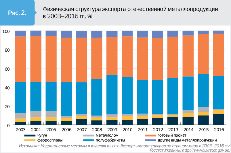 Соответственно, сейчас основными продуктовыми группами в структуре экспорта отечественной металлопродукции являются полуфабрикаты и готовый прокат (см. рис. 2).