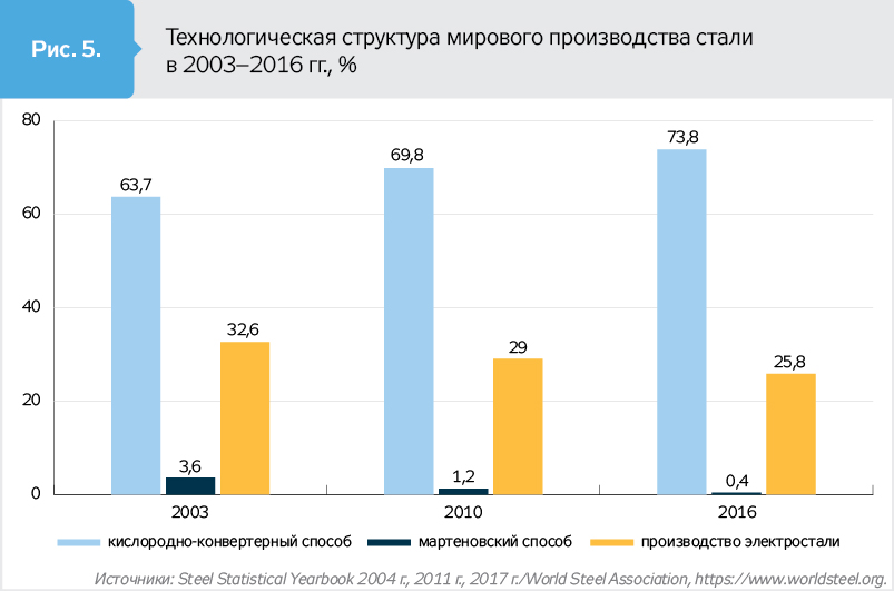 Такая политика позволяла отечественным предприятиям дешевым способом наращивать металлургическое производство и максимально использовать благоприятную конъюнктуру, складывающуюся на мировом рынке черных металлов. В результате на большинстве из них наблюдается довольно значительный физический и моральный износ оборудования (50–65%), у них низкая производительность труда, большая материало- и энергоемкость производства, что характеризуется в том числе и значительным распространением мартеновского производства (см. рис. 4), почти не использующегося в мире (см. рис. 5).
