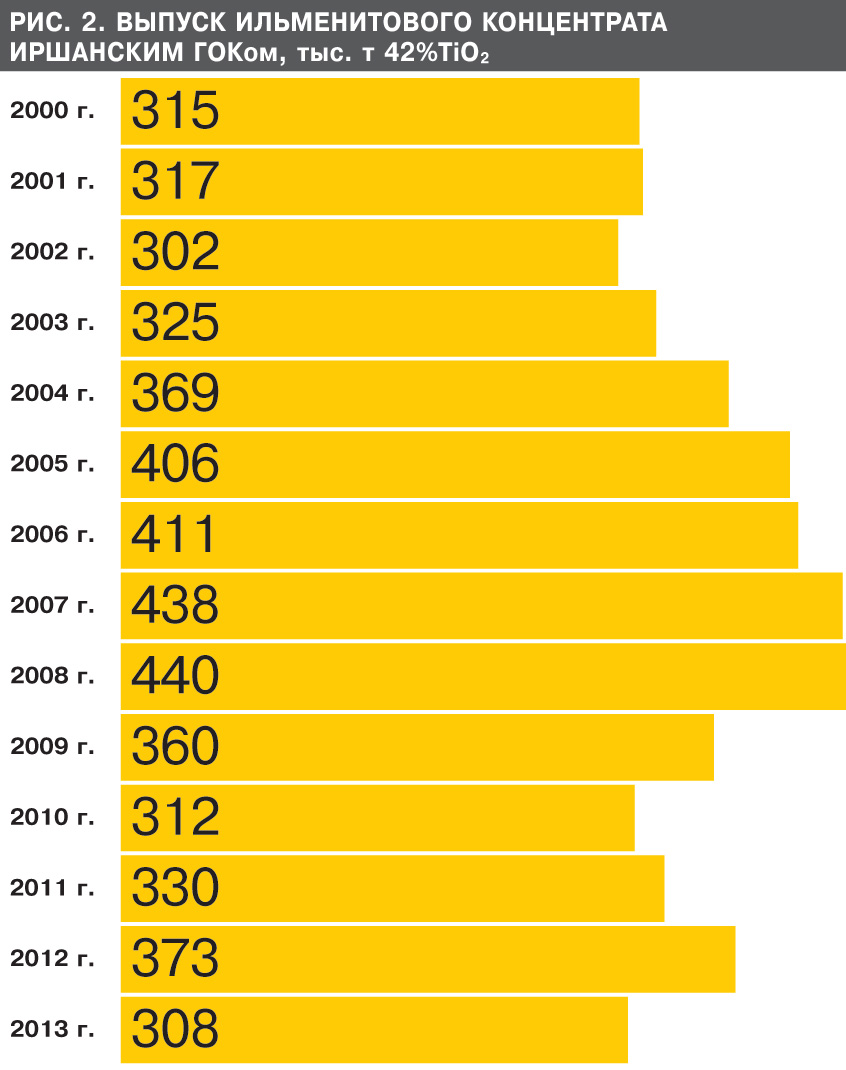 Что касается объемов производства ильменитового концентрата, то с 2008 г. и по сей день они составляют ежегодно около 500 тыс. т с учетом объемов, производимых Междуреченским ГОКом и СП ООО "Валки-ильменит" - по сути, цехами Иршанского ГОКа со статусом юридических лиц.