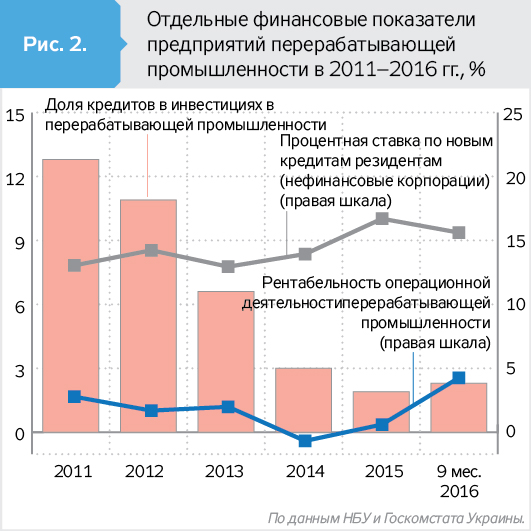 Предприятия промышленности (особенно перерабатывающей) в своей инвестиционной активности почти полностью отлучены от финансового рынка. Так, доля кредитов в инвестициях в перерабатывающую промышленность сократилась до 1,9% (2015 г.), тогда как еще в 2011-м она составляла 12,8% (рис. 2). В ряде отраслей перерабатывающей промышленности вообще прекращено использование заемных и привлеченных средств в производственных инвестициях. Недоступность заемных средств обусловлена, прежде всего, дороговизной кредитных ресурсов. Ставки по банковским кредитам превышают рентабельность промышленной деятельности в четыре и более раза (рис. 2). Процентную политику центрального и коммерческих банков справедливо оценивают как механизм выстраивания стены между банками и производством, закрывающей перспективы роста и для экономики, и для банков. Соответственно, значительная часть промышленных предприятий не имеет "платежеспособного" спроса на кредиты и страдает от нехватки инвестиций.