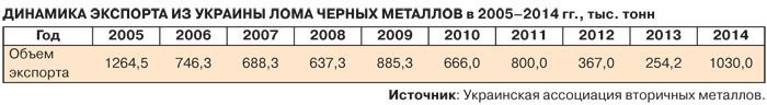 Кроме того, количество металлолома в стране, увы, дополнительно увеличится в связи с трагедией на Востоке Украины. Поэтому для сбора 5,5–6,0 млн т лома черных металлов не требуются сверхусилия. Получается, что Украина в 2015 г. может и должна экспортировать 2,36–2,86 млн т металлолома. При доведении заготовки лома до 8–11 млн т в год, как было в конце 2000-х и что вполне реально, объемы его экспорта могут быть увеличены до 4 млн т в год.