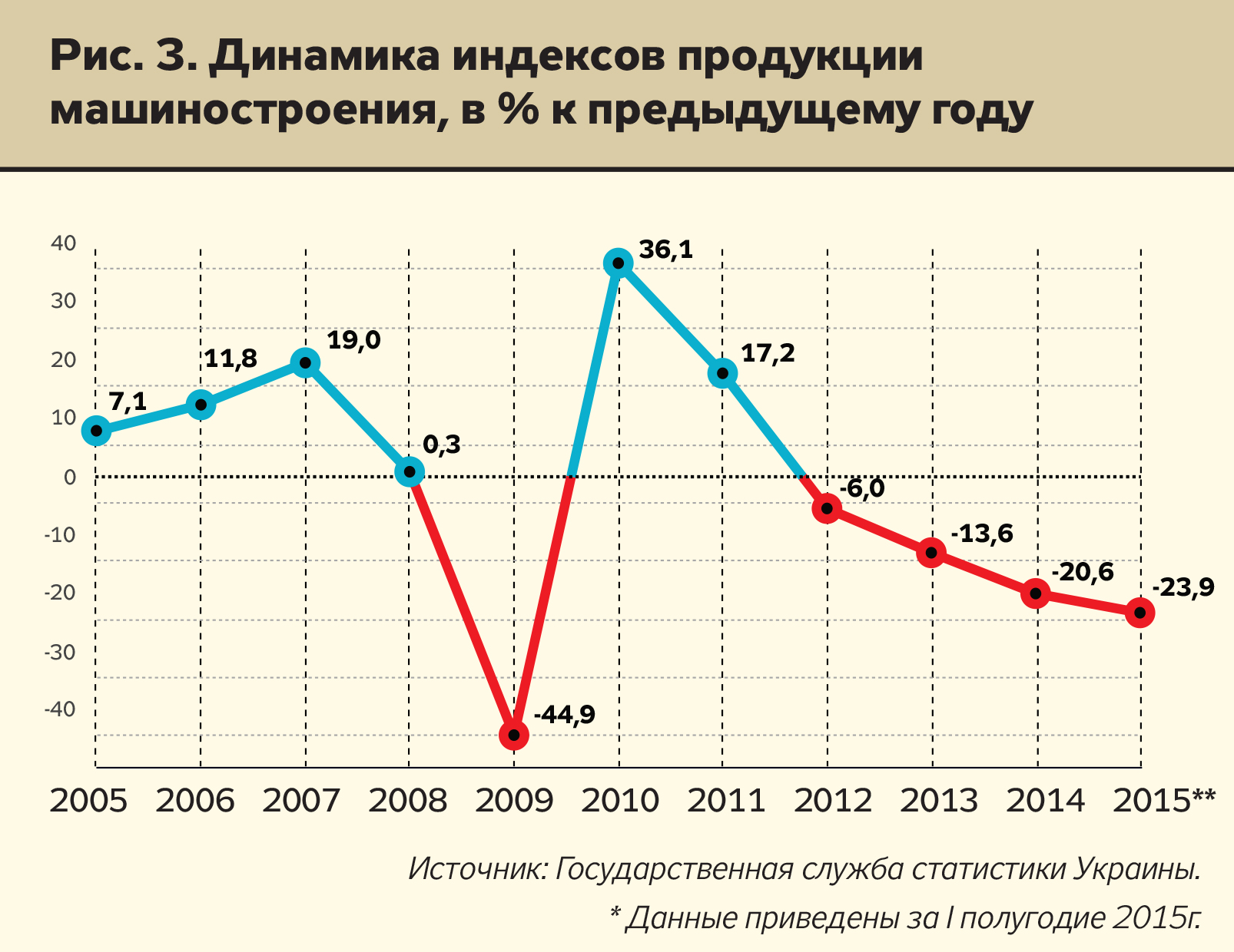 Просто удивительно, когда весь развитый мир старается наращивать производство высокотехнологичных товаров, Украина упрямо продолжает двигаться в обратном направлении. Экспорт продукции машиностроения - главной отрасли промышленности, влияющей на развитие других сфер хозяйствования, - в первом полугодии 2015-го составил всего 60,8% предыдущего года, что является, в том числе, результатом общего падения объемов производства машиностроительной продукции в последние годы.