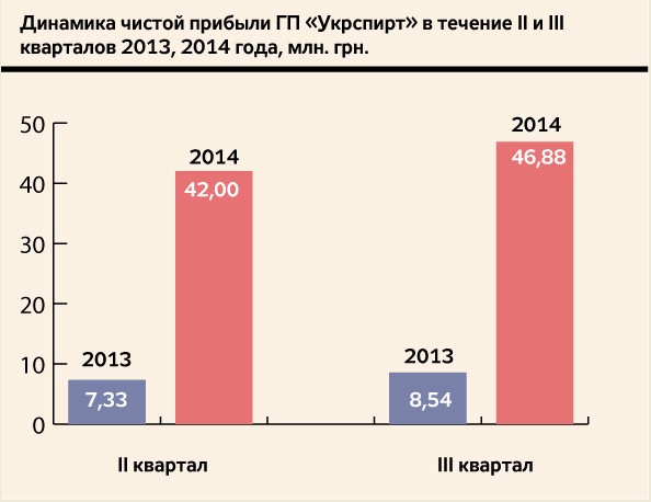 Наверное сегодня найдется не много предприятий частной или акционерной формы собственности, которые в пять с лишним раз нарастили свой чистый доход по сравнению с прошлогодним. Зато государственное предприятие "Укрспирт" по итогам работы за II и III кварталы 2014 г. зафиксировало 88,9 млн грн чистой прибыли против 15,8 млн грн в аналогичном периоде 2013 г. В результате расчетная сумма отчислений в госбюджет от этой прибыли составила 27,7 млн грн против прошлогодних 2,4 млн грн, то есть увеличилась более чем в 11 раз.