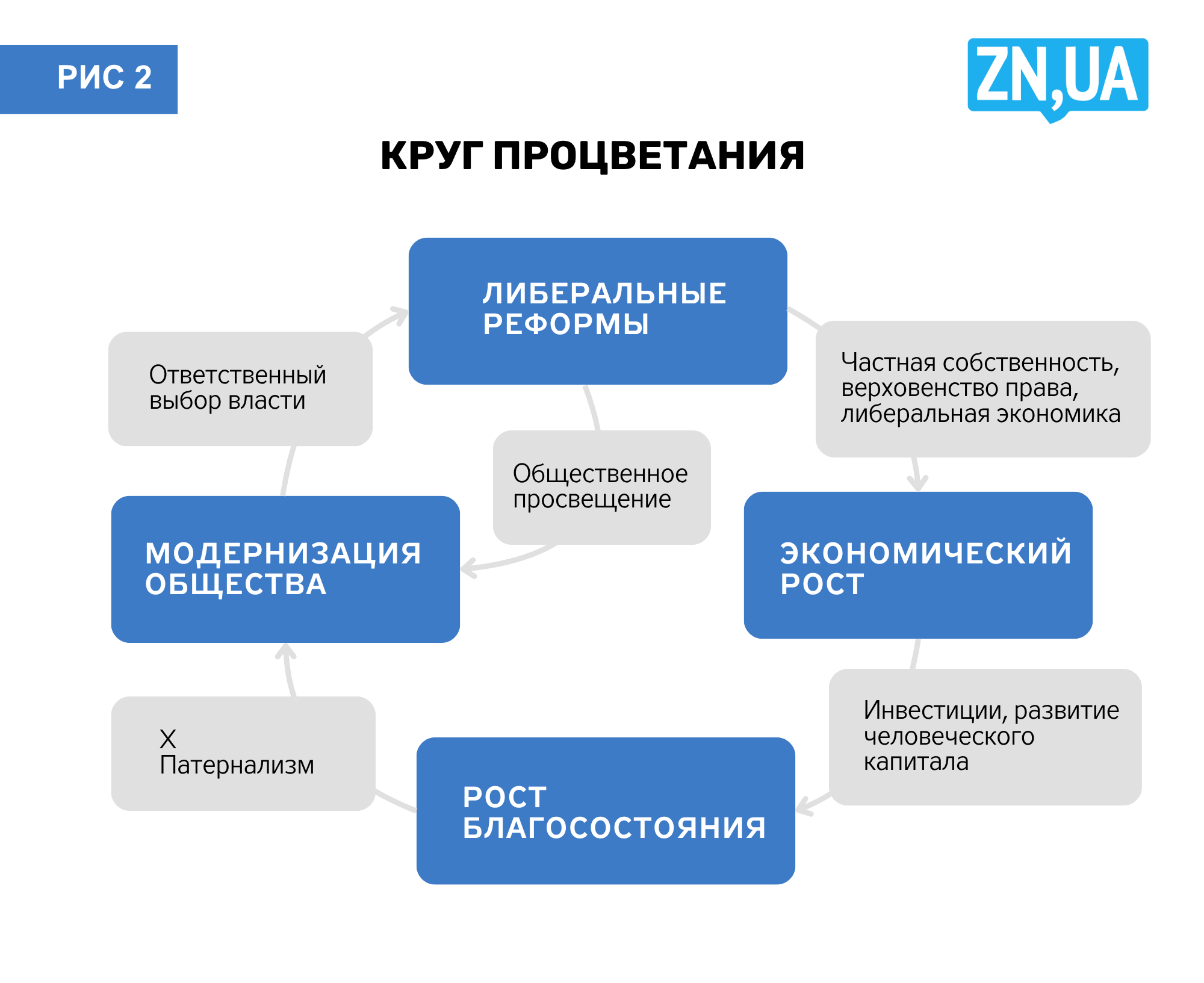 Выход из этой ситуации возможен только путем модернизации общества и стремительного экономического роста. На рис. 2 изображен круг, ведущий к процветанию.