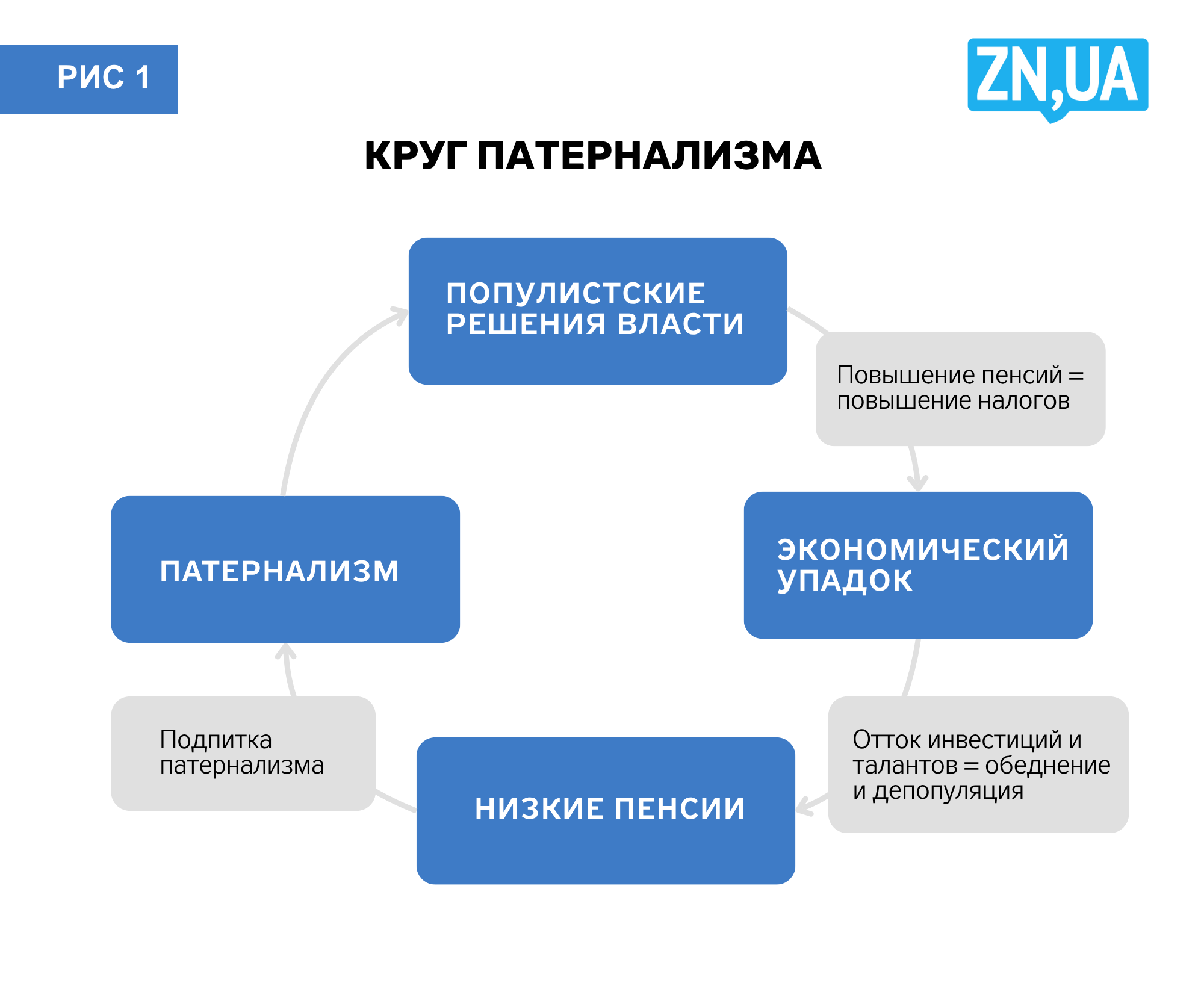 Низкие пенсии — это результат решений, принятых в прошлом избранной нами же властью. Избиралась она из-за недостатка критического мышления и экономической грамотности общества. И вот мы уже в замкнутом круге патернализма и упадка (см. рис. 1).