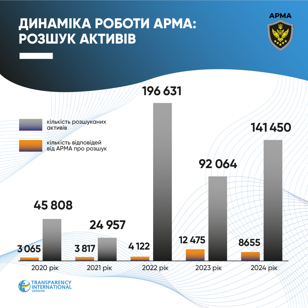 По данным отчетности АРМА, в 2024 году Агентство выявило и разыскало 141,5 тыс. единиц активов. Это больше, чем в 2023-м (96 тыс.), но значительно меньше, чем в 2022-м (196,6 тыс.).