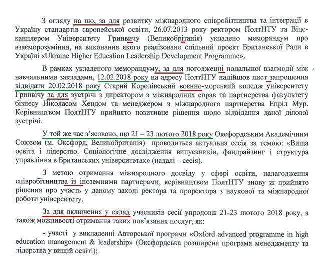 На самом деле переговорная процедура закупки услуг по участию в сессии состоялась еще 9 января. 23-го числа того же месяца между ПНТУ и ЧП "Восточноукраинская академия бизнеса" был заключен договор, оглашенный на платформе ProZorro. Приказы о командировке в Великобританию ректора и проректора увидели свет 6 и 7 февраля.