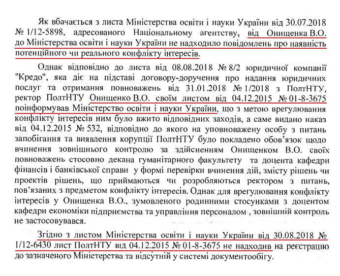 Как следует из документа, руководитель вуза пытался схитрить и тут. Через юридическую фирму "Кредо" (она же защищает интересы ПНТУ в суде со мной) Онищенко хотел убедить НАПК в том, что конфликт якобы урегулирован еще в 2015 г. Вот только МОН не обнаружило у себя и следа соответствующего письма.