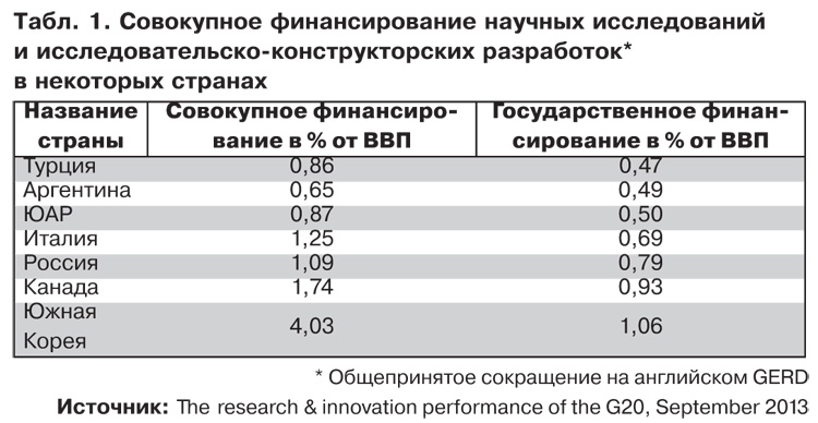 Отдельно следует сказать о многолетних заклинаниях представителей научной элиты (хочется взять это слово в кавычки) о легендарных 1,7% ВВП на науку, которых ни одно правительство не может обеспечить. Действительно, эта цифра заложена в соответствующем законе, но она включает и НЕбюджетное финансирование. И здесь возникает важный вопрос - а какую, собственно, часть должно финансировать государство? Очевидно, в условиях, когда бывшее "народное хозяйство" подверглось тотальной приватизации, абсолютное большинство прикладных научных разработок должен финансировать частный бизнес, а не государство. Единственное большое исключение - разработки для укрепления обороноспособности Украины. Но, как теперь стало совершенно очевидно, ими серьезно никто не занимался. Во времена СССР государство просто обязывало предприятия выделять определенную часть доходов "на науку". Наши научные генералы это хорошо знают, и было бы логично, чтобы они не кричали "Государство, дай денег!", а лоббировали законы, которые стимулировали бы украинских олигархов вкладывать деньги в прикладную науку и научные разработки. Вместо этого наши академики, чиновники МОН и депутаты-популисты регулярно вводят общество в заблуждение, утверждая о заоблачных процентах ВВП, которые, мол, выделяют на научно-техническую сферу в других странах. Ниже приведена таблица с соответствующими данными, взятыми из исследования The research & innovation performance of the G20. Ее опубликовало в 2013-м вышеупомянутое агентство Reuters. Чтобы не утомлять читателя цифрами (больше можно легко найти в Интернете), часть стран "Большой двадцатки" опускаем (США, Индия, Китай, Германия), поскольку экономика этих стран несравненно мощнее, чем украинская.
